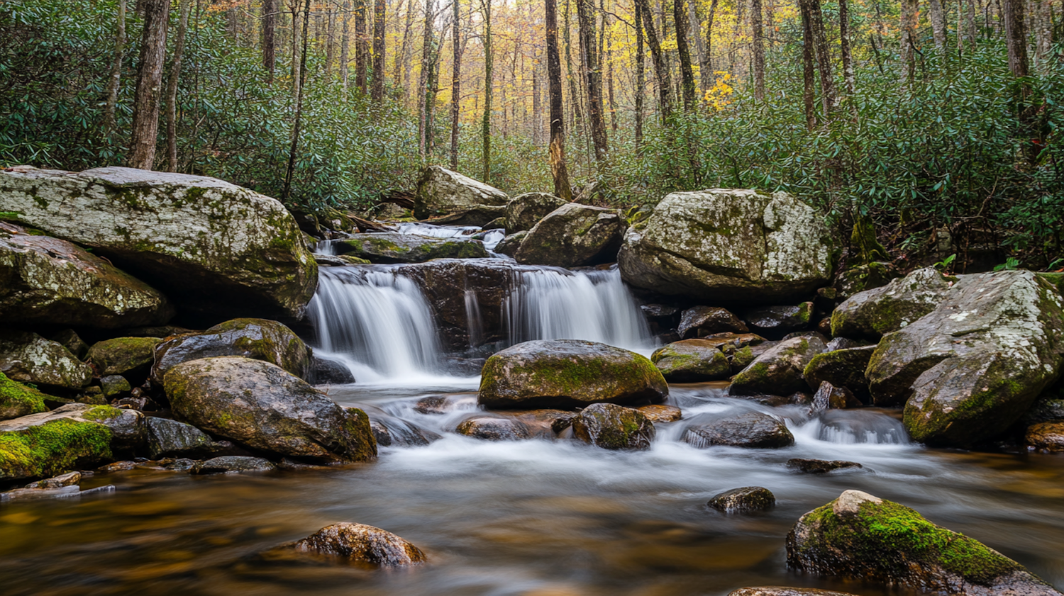 Tranquil forest waterfall with mossy rocks and autumn trees, creating a serene and peaceful natural scene.