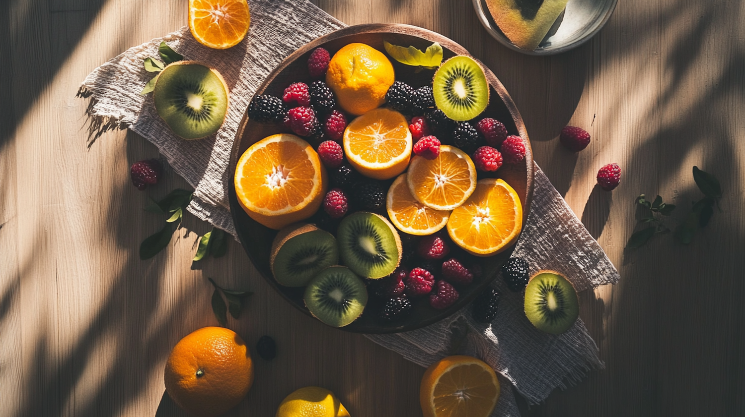 A vibrant assortment of sliced oranges, kiwis, raspberries, and blackberries on a rustic wooden table in warm sunlight.