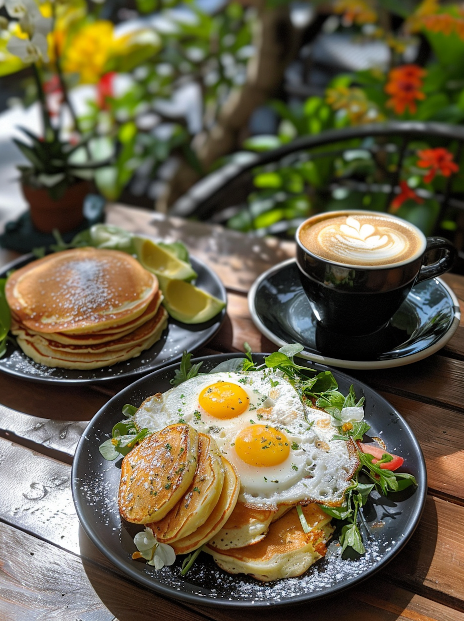 Delicious breakfast with pancakes, sunny-side-up eggs, and cappuccino in a lush outdoor setting with vibrant greenery and flowers.