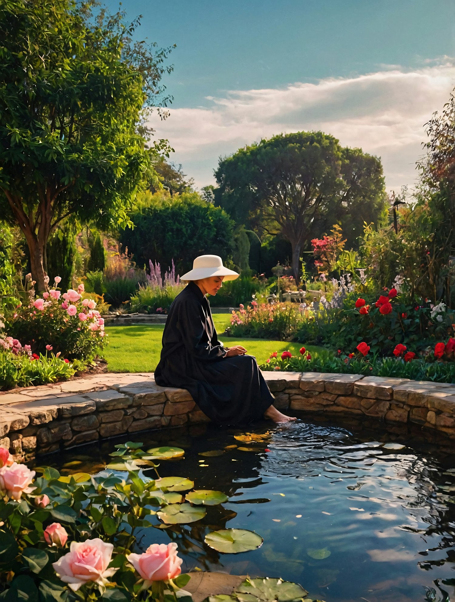 Woman in a garden, wearing a white hat, sits by a pond with lily pads, surrounded by vibrant flowers and greenery.