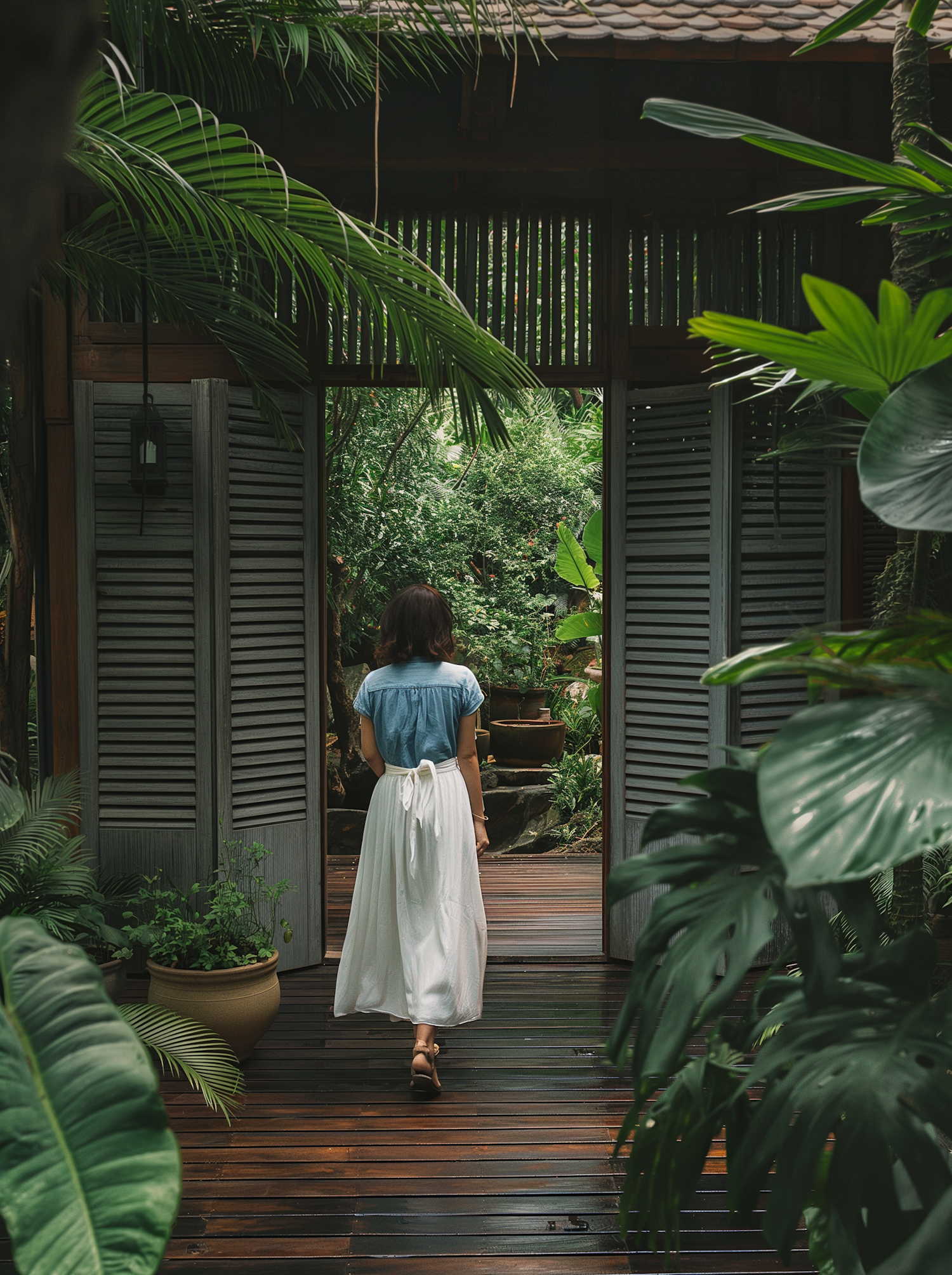 Woman in blue top and white skirt walking through lush tropical garden with wooden shutters and deck.