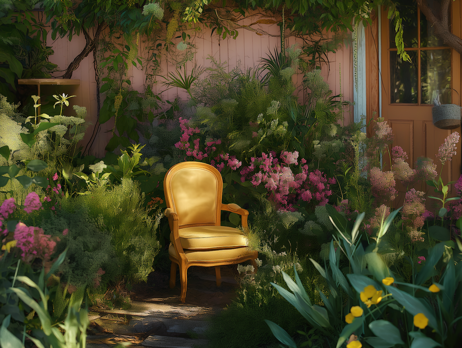 A vintage yellow armchair in a lush garden with vibrant flowers and greenery, creating a serene and inviting atmosphere.