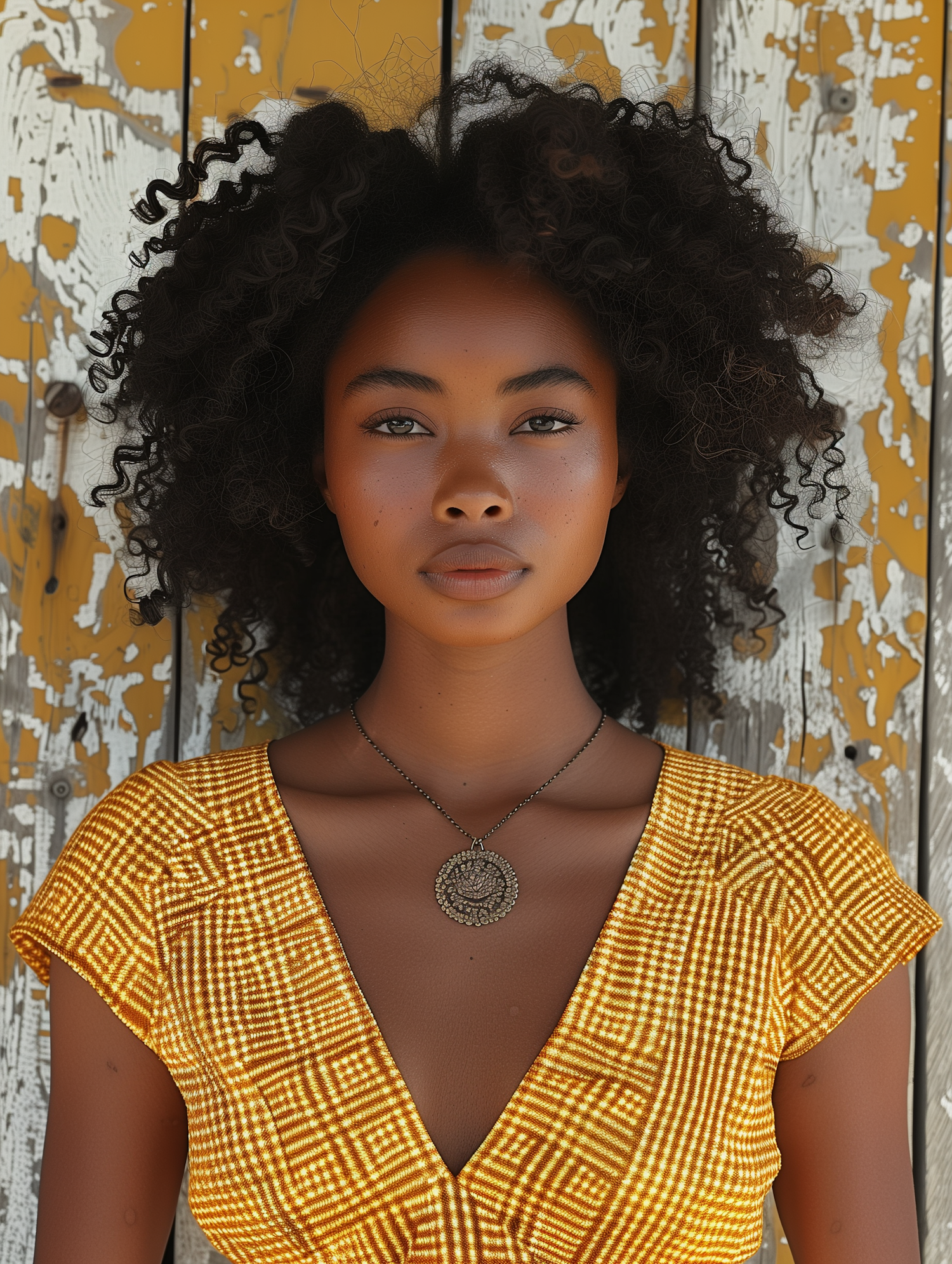 A young woman with curly hair in a yellow dress stands against a rustic wooden background, exuding confidence and elegance.