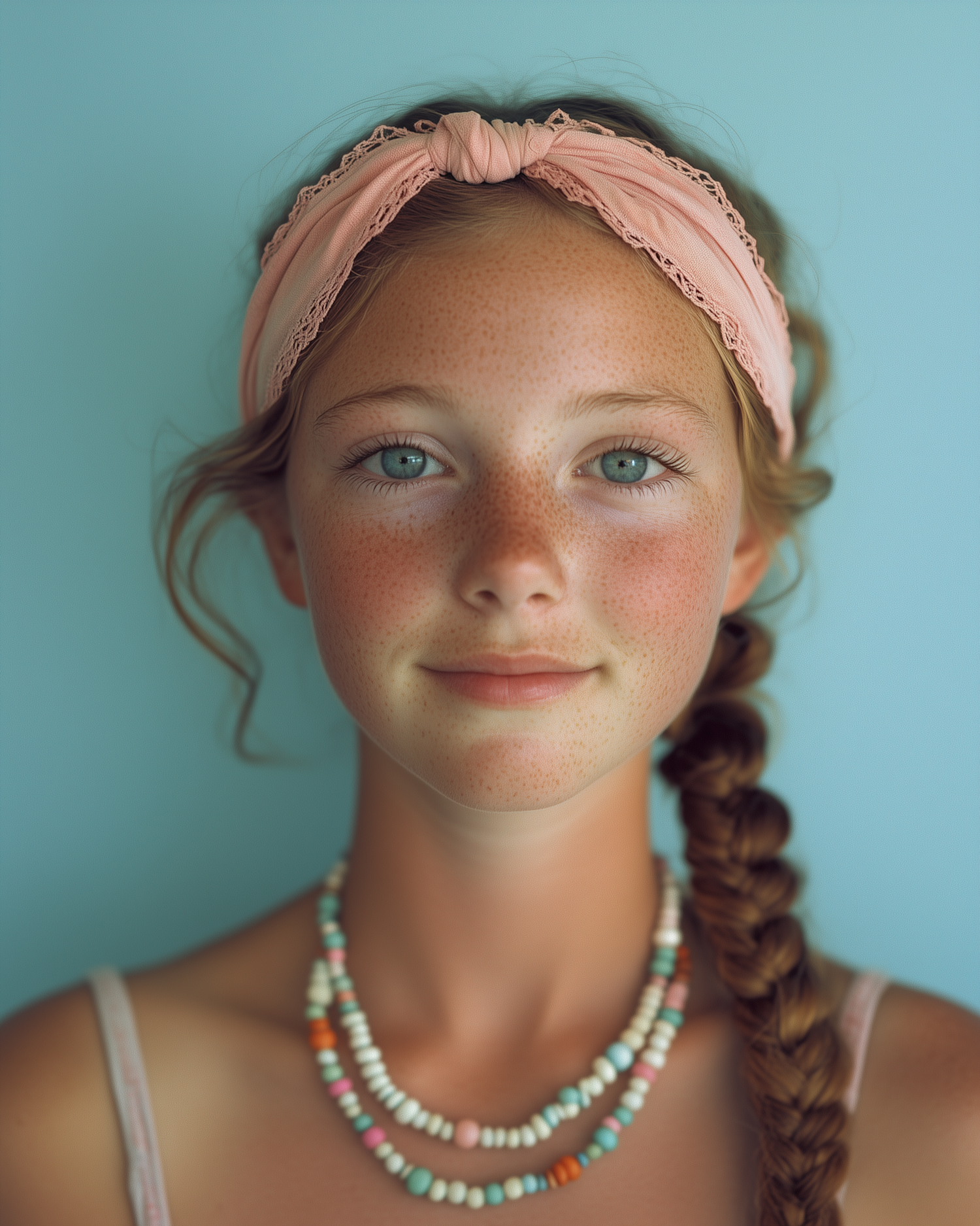 Young girl with freckles, pink headband, and colorful necklaces against a teal background, exuding a serene and playful vibe.