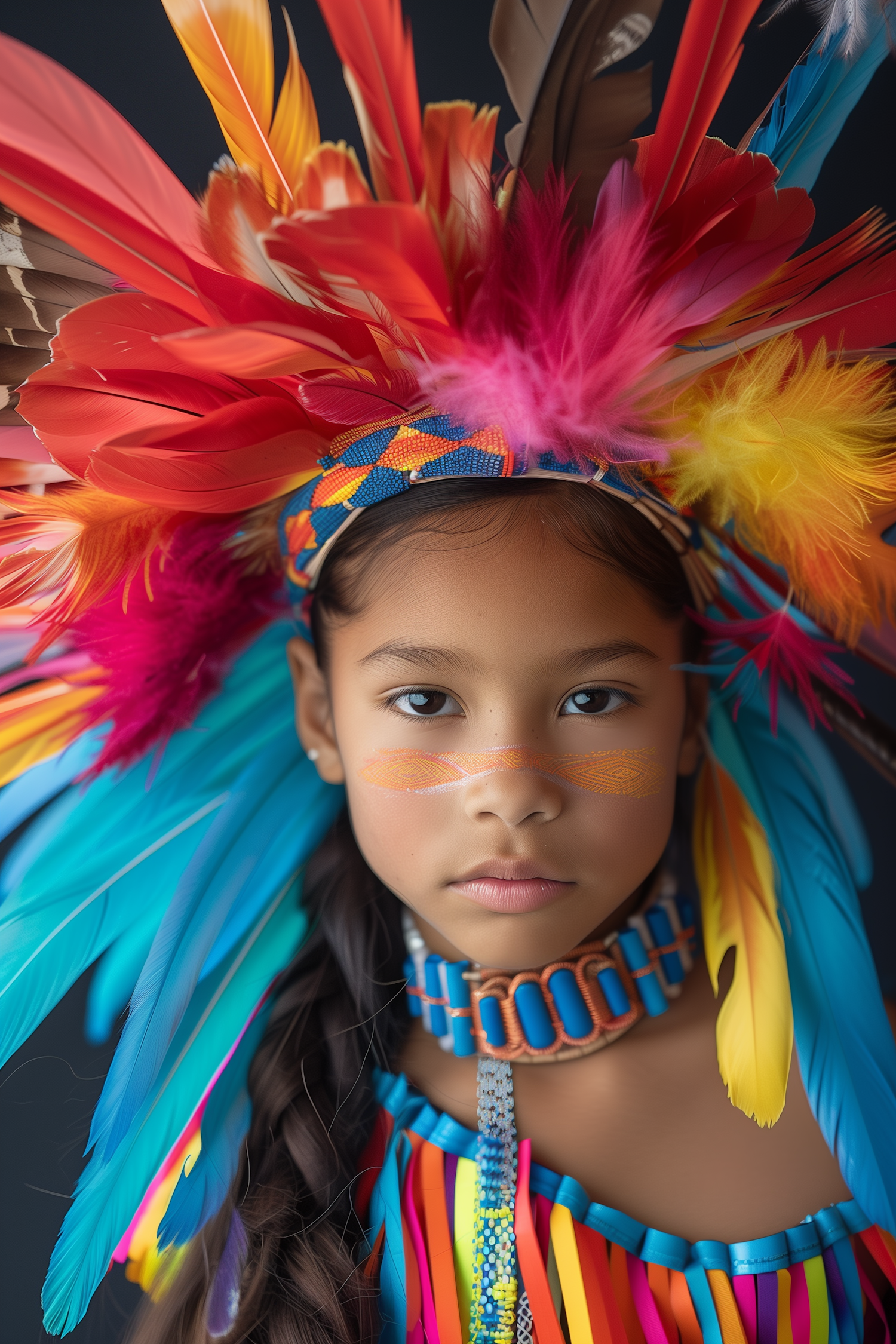 Young girl in vibrant feathered headdress and face paint, showcasing cultural attire with colorful feathers and beads.