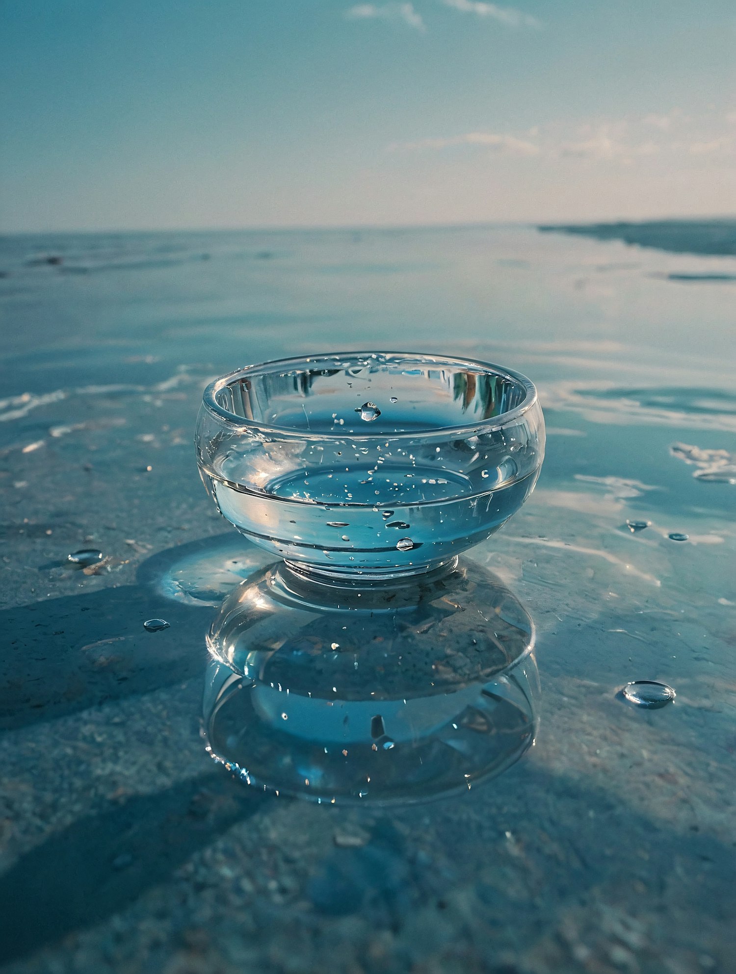 A clear glass bowl of water sits on a reflective surface, blending with a serene sea and sky backdrop. Droplets add a fresh, tranquil touch.