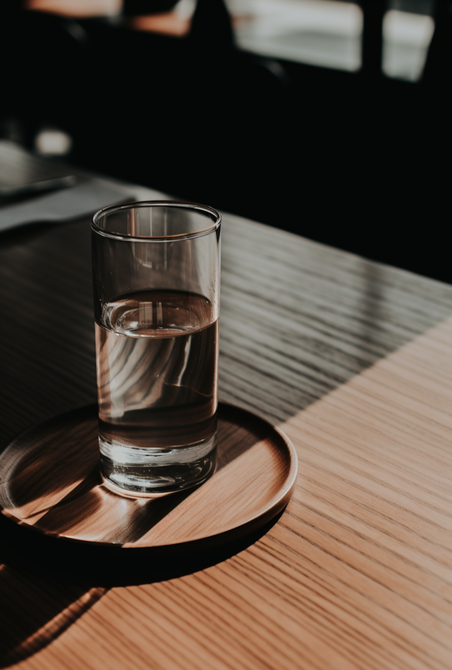 A glass of water on a wooden coaster, bathed in warm sunlight, casting shadows on a wooden table.