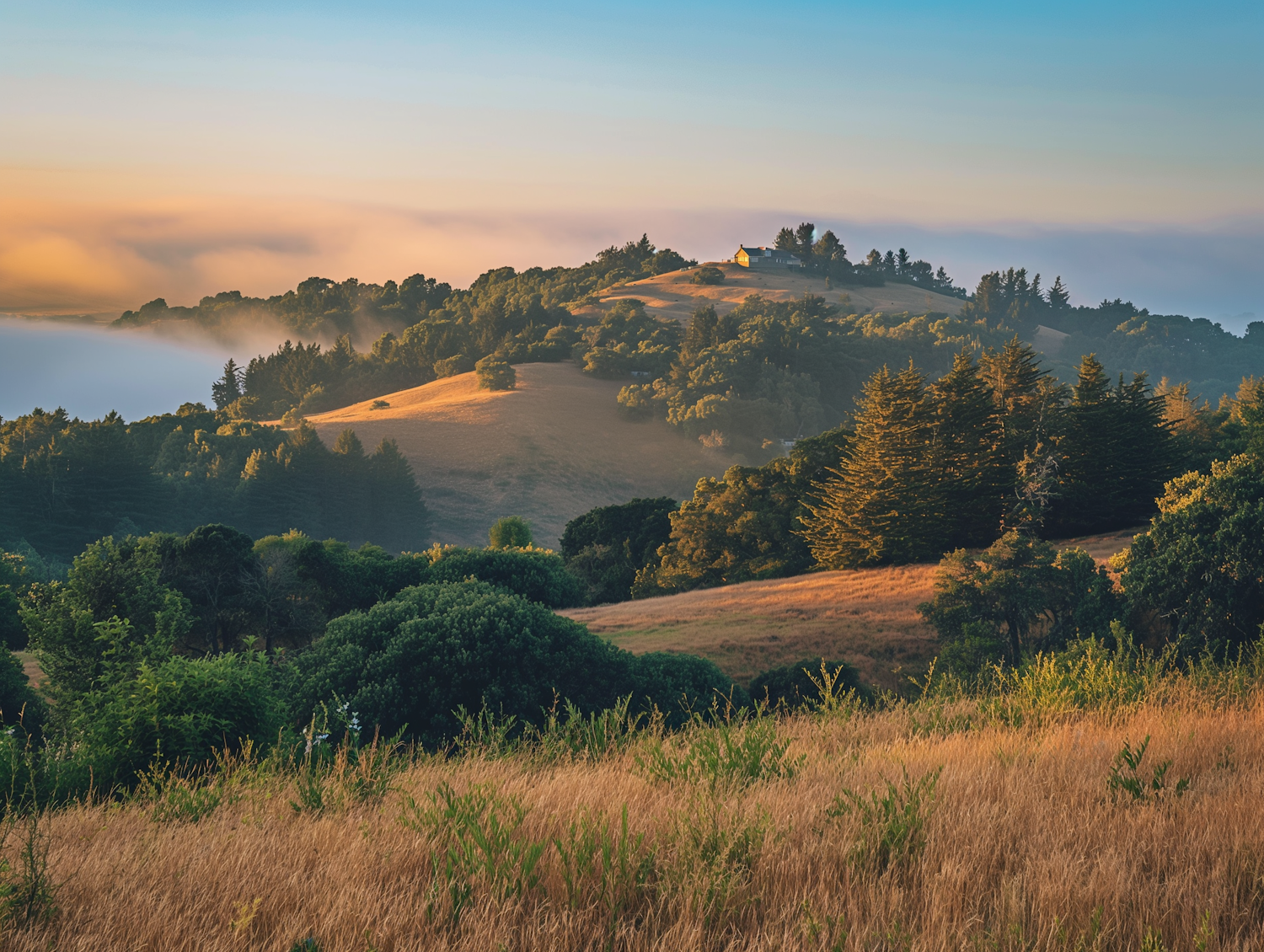 Serene landscape with rolling hills, a small house, and misty background under a warm, glowing sky.