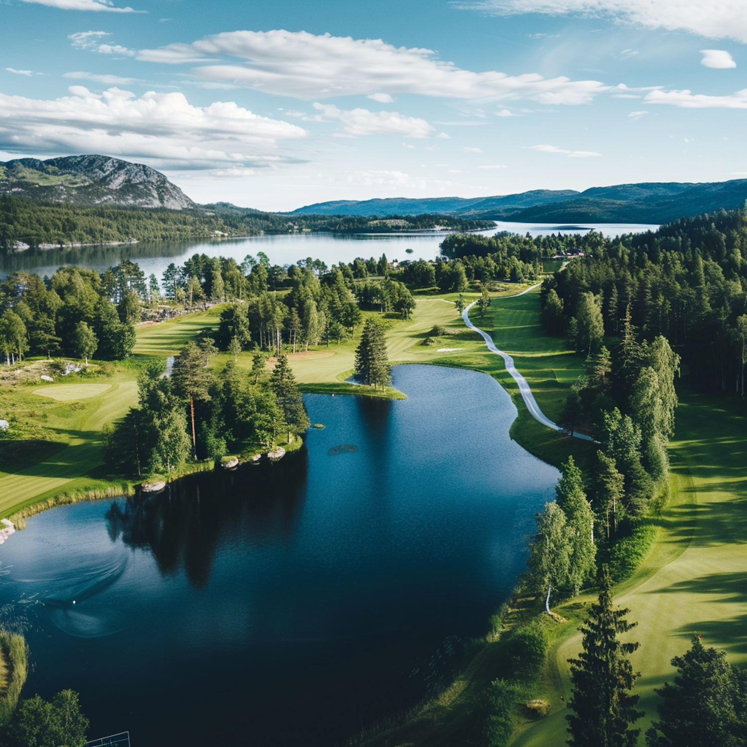 Aerial view of a lush golf course with a serene lake, surrounded by forests and mountains under a clear blue sky.
