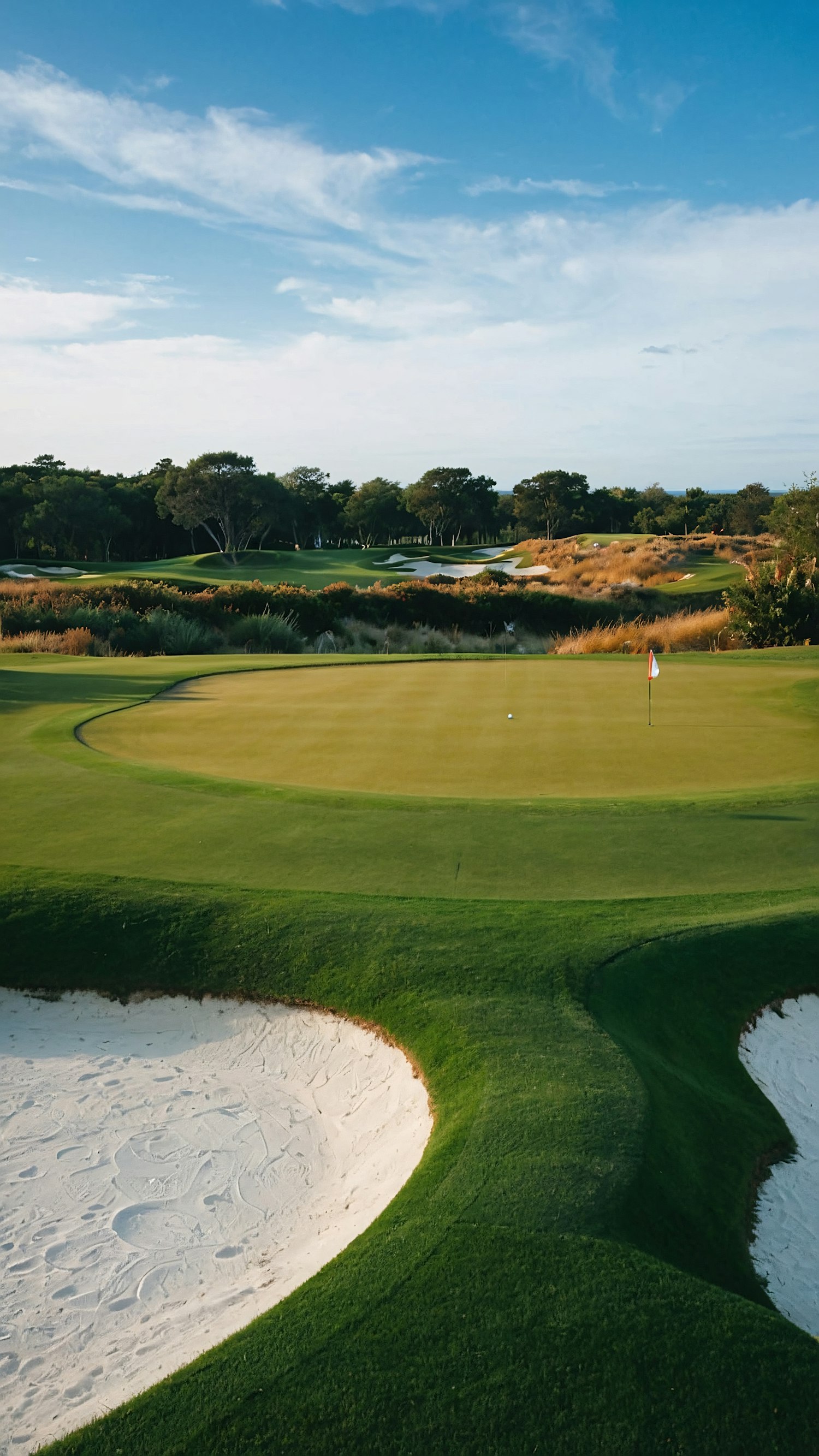 Beautiful golf course with a lush green, sand bunkers, and a bright blue sky. Perfect for a relaxing day of golf in nature.