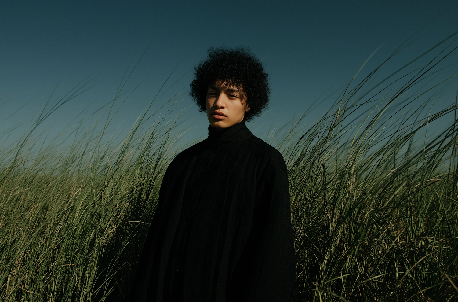 A person in a black outfit stands in tall green grass under a clear blue sky, creating a serene and natural atmosphere.
