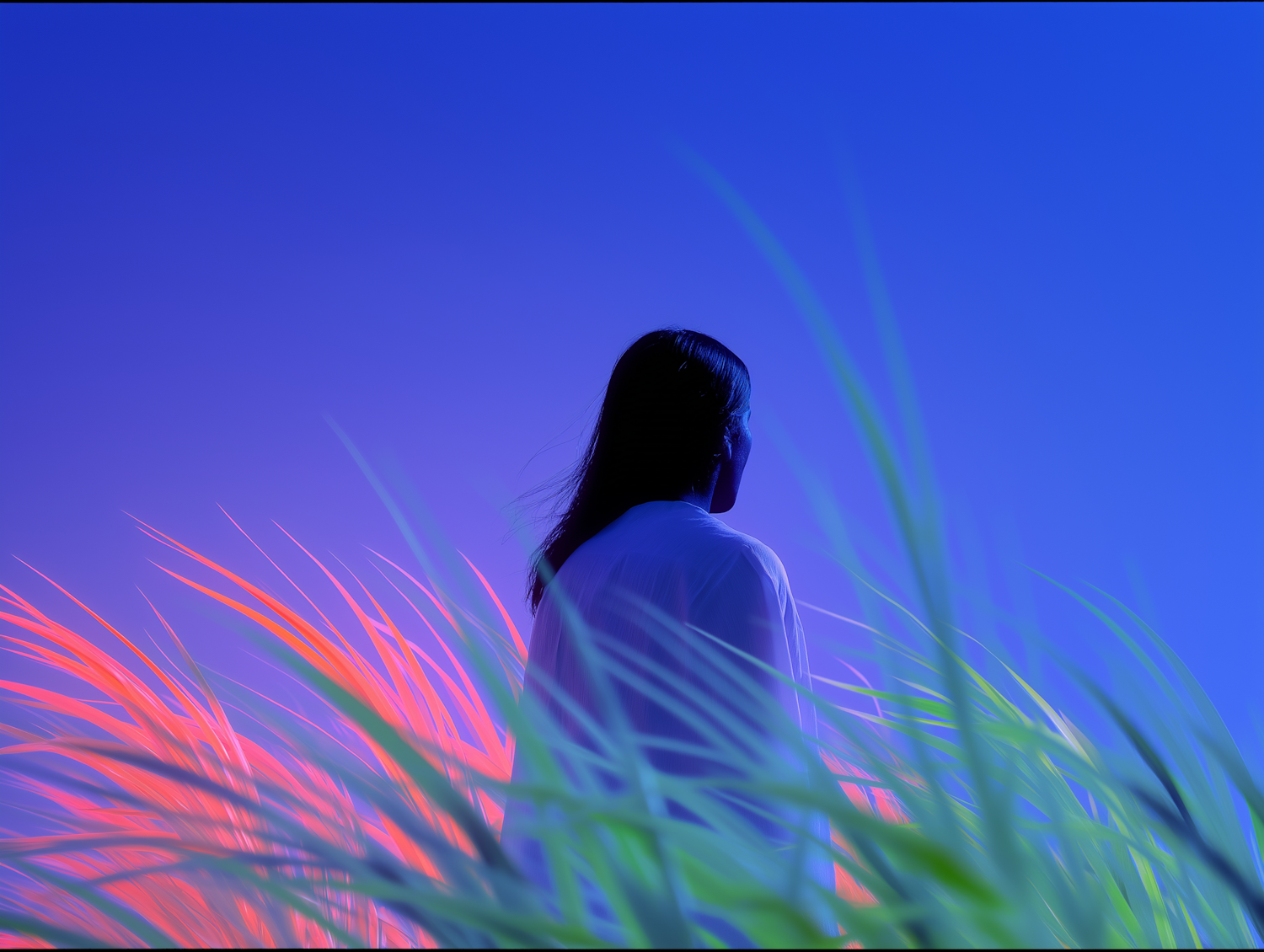 A serene scene of a person standing in colorful grass under a vibrant blue and purple sky, evoking tranquility and wonder.
