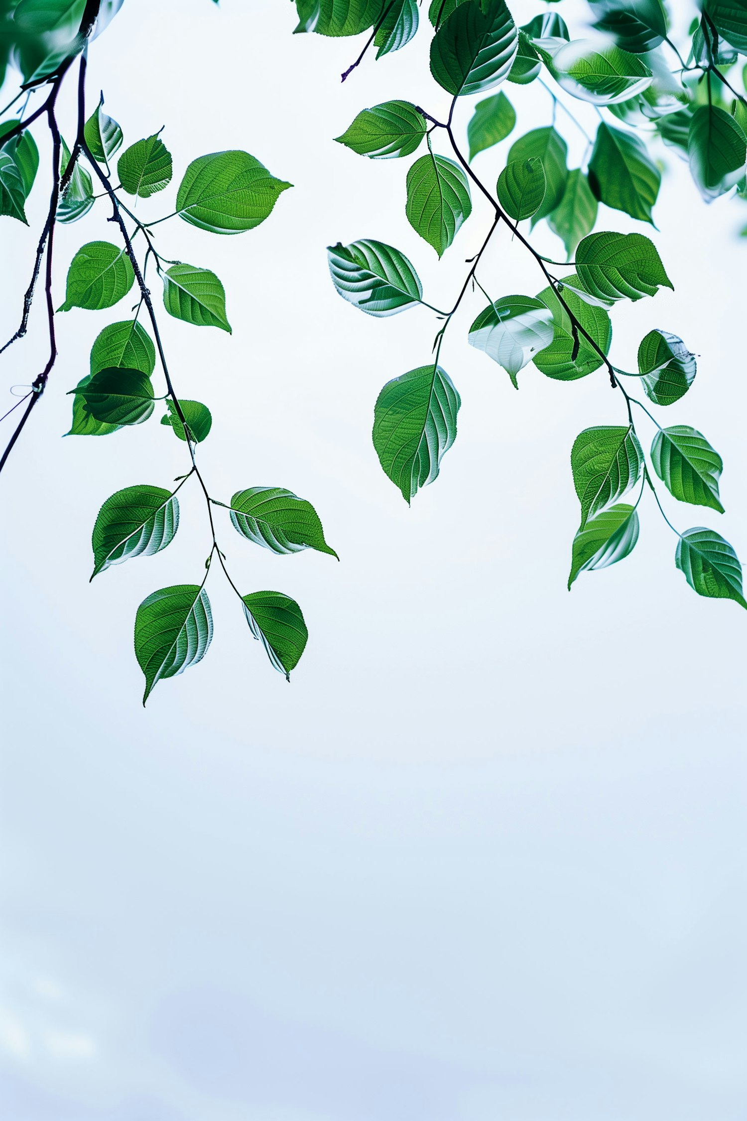 Vibrant green leaves with white stripes against a clear blue sky, creating a serene and natural atmosphere.