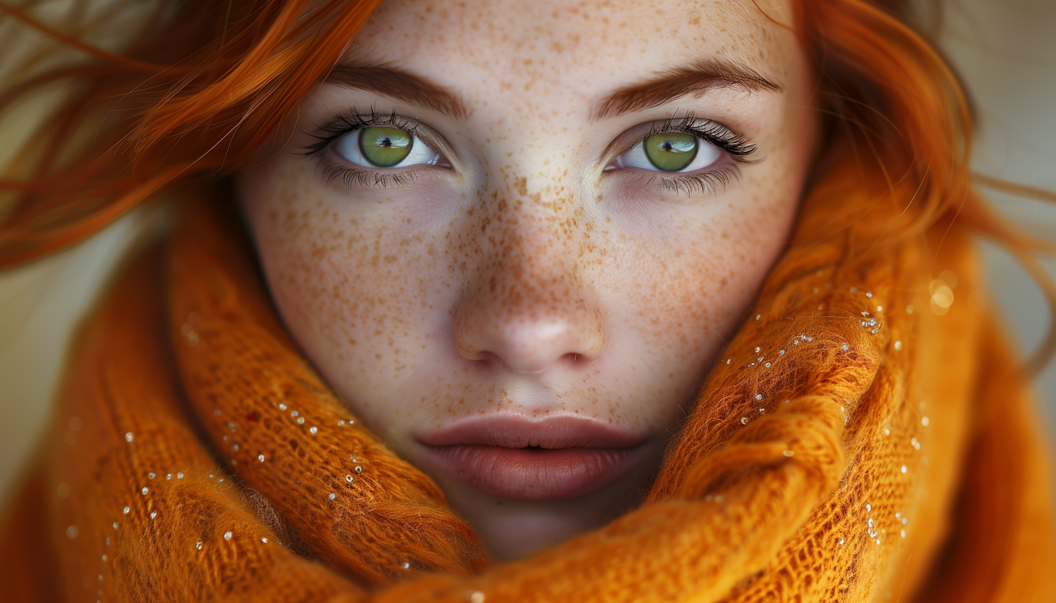 Close-up of a woman with green eyes, red hair, and freckles, wrapped in an orange scarf with sparkling beads.