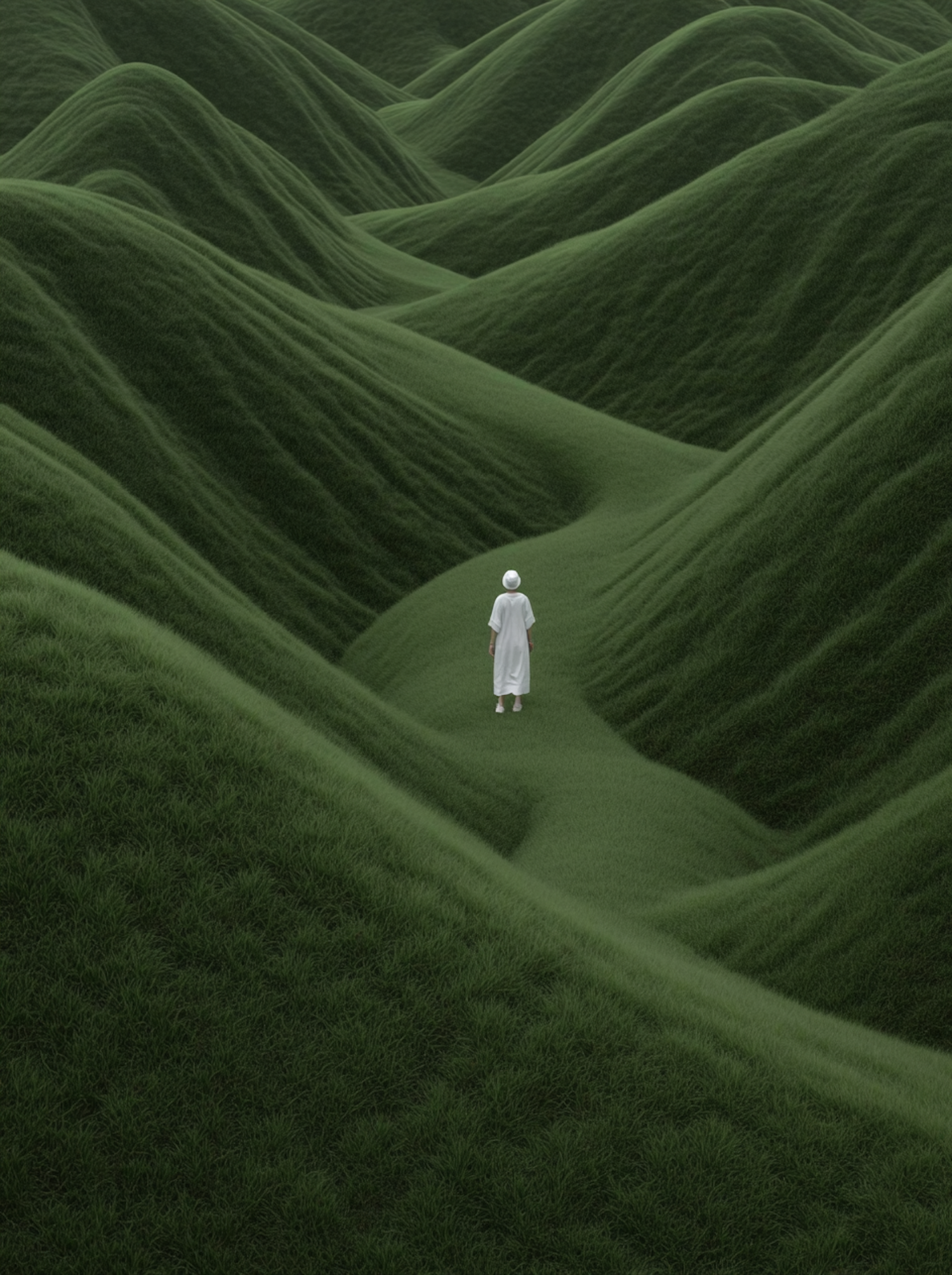 A person in white stands amidst rolling green hills, creating a serene and tranquil scene with soft lighting and lush grass.