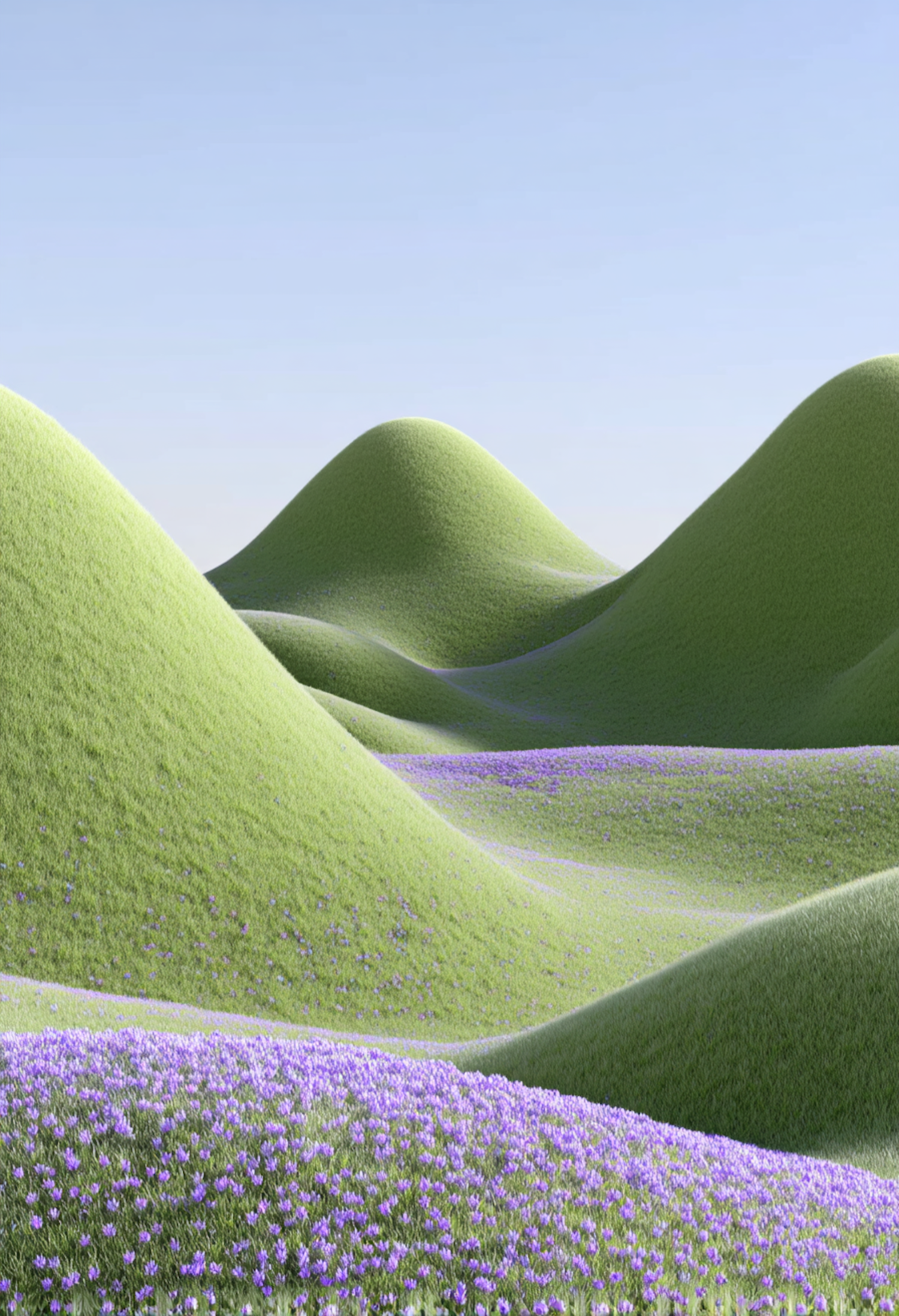Rolling green hills adorned with purple wildflowers under a clear blue sky, creating a serene and picturesque landscape.
