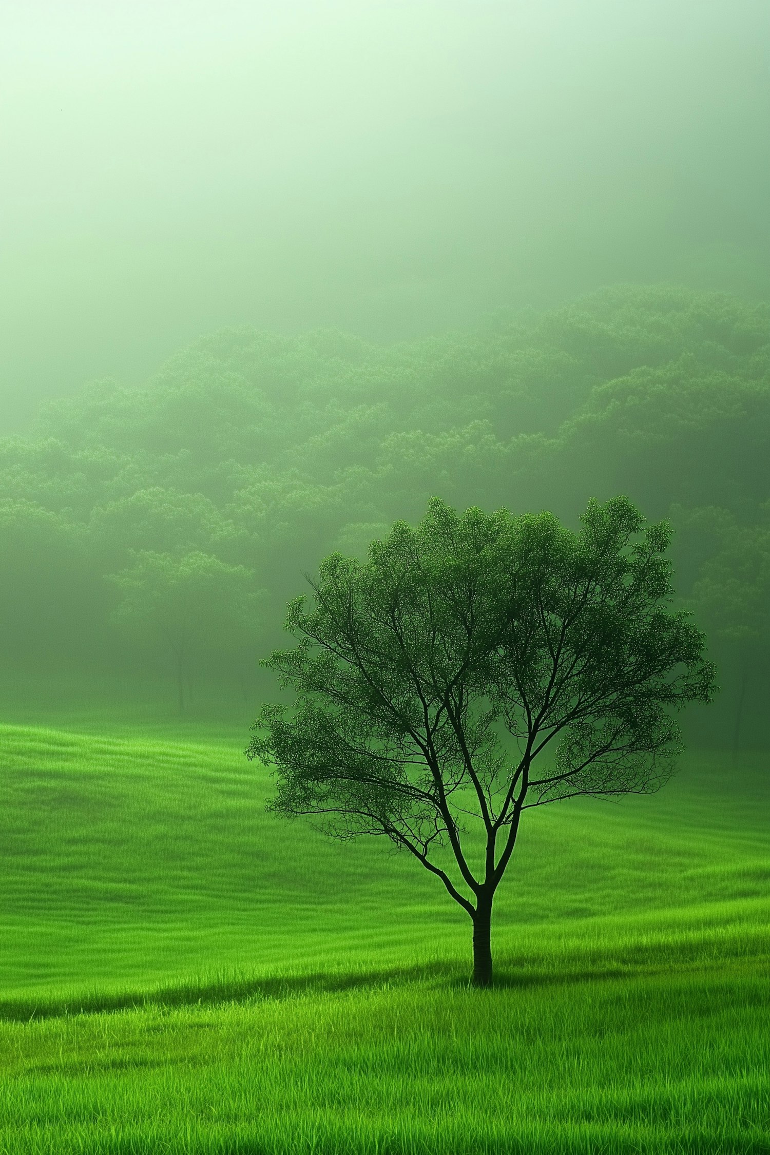 A peaceful green field with a lone tree and a misty forest in the background, perfect for nature lovers and serene landscape enthusiasts.