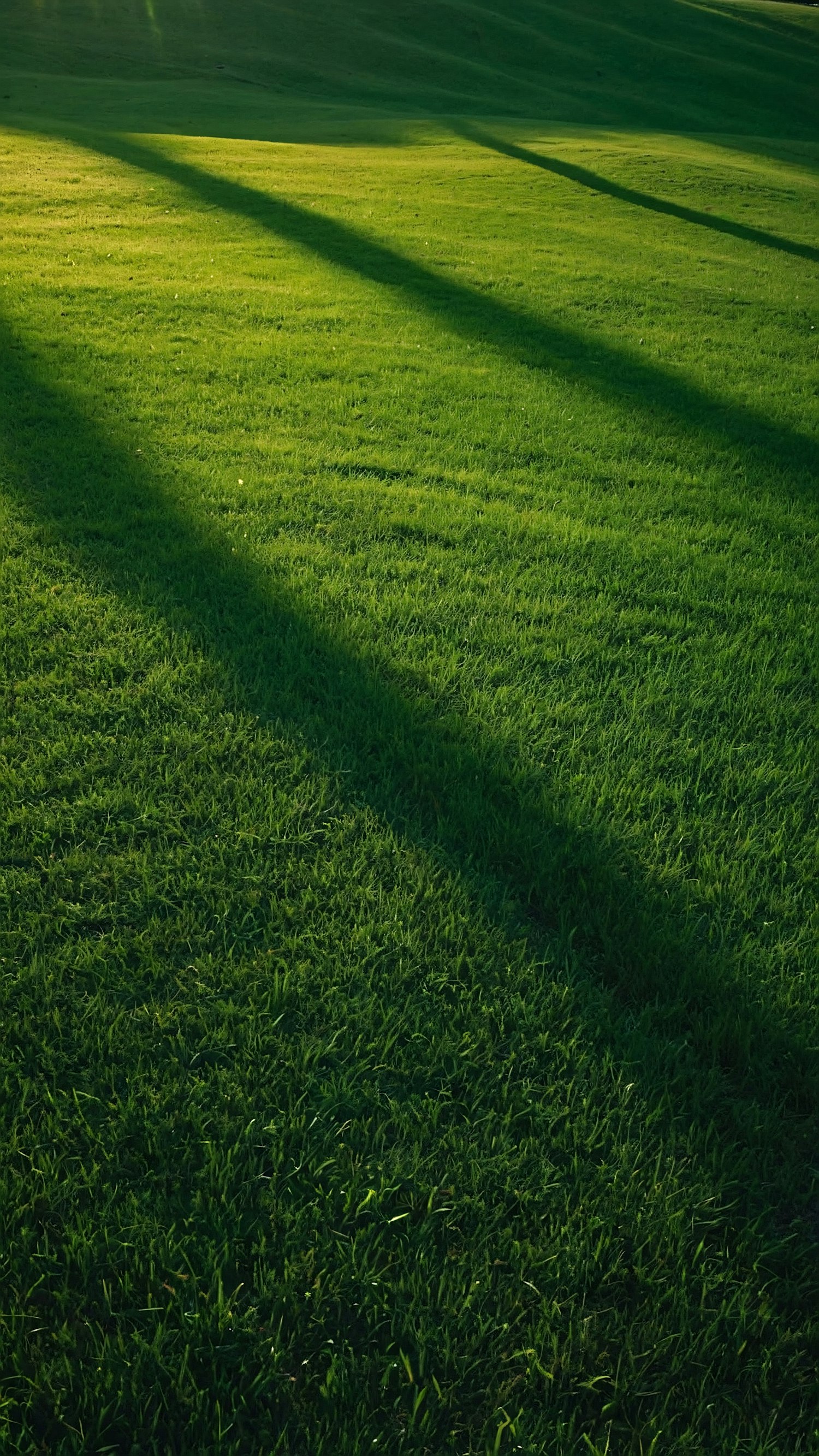 A peaceful green field with long shadows and soft sunlight, creating a serene and natural atmosphere perfect for relaxation.