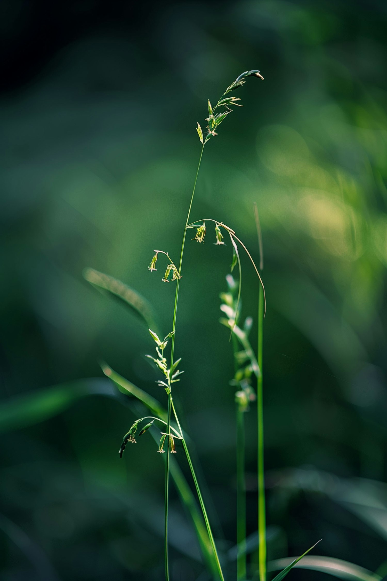 Close-up of a slender green grass stem with delicate seed heads against a blurred green background, creating a serene natural scene.