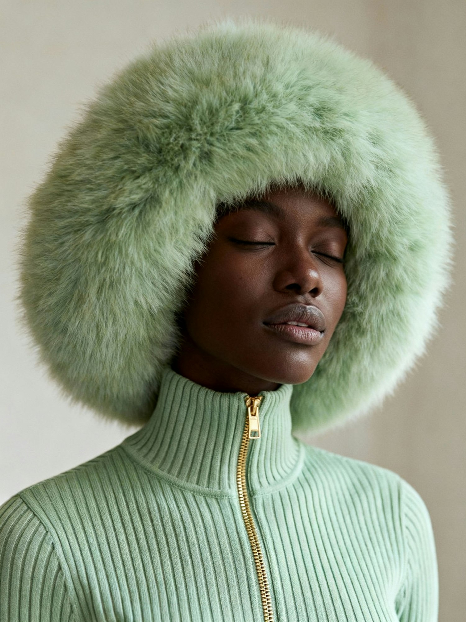 A fashion-forward editorial portrait of a Black woman wearing a voluminous light green fluffy fur hat and a matching light green ribbed zip-up top with a high collar and gold zipper. Her expression is serene and composed, with relaxed eyes and a soft, peaceful gaze. The hat creates a rounded silhouette that frames her face gently. The lighting is soft and ambient, highlighting the luxurious texture of the fur and the ribbed fabric. The background is plain and neutral, keeping the focus on the outfit and her tranquil demeanor. The mood is calm, elegant, and winter-chic—blending cozy textures with quiet confidence in a minimalist setting.