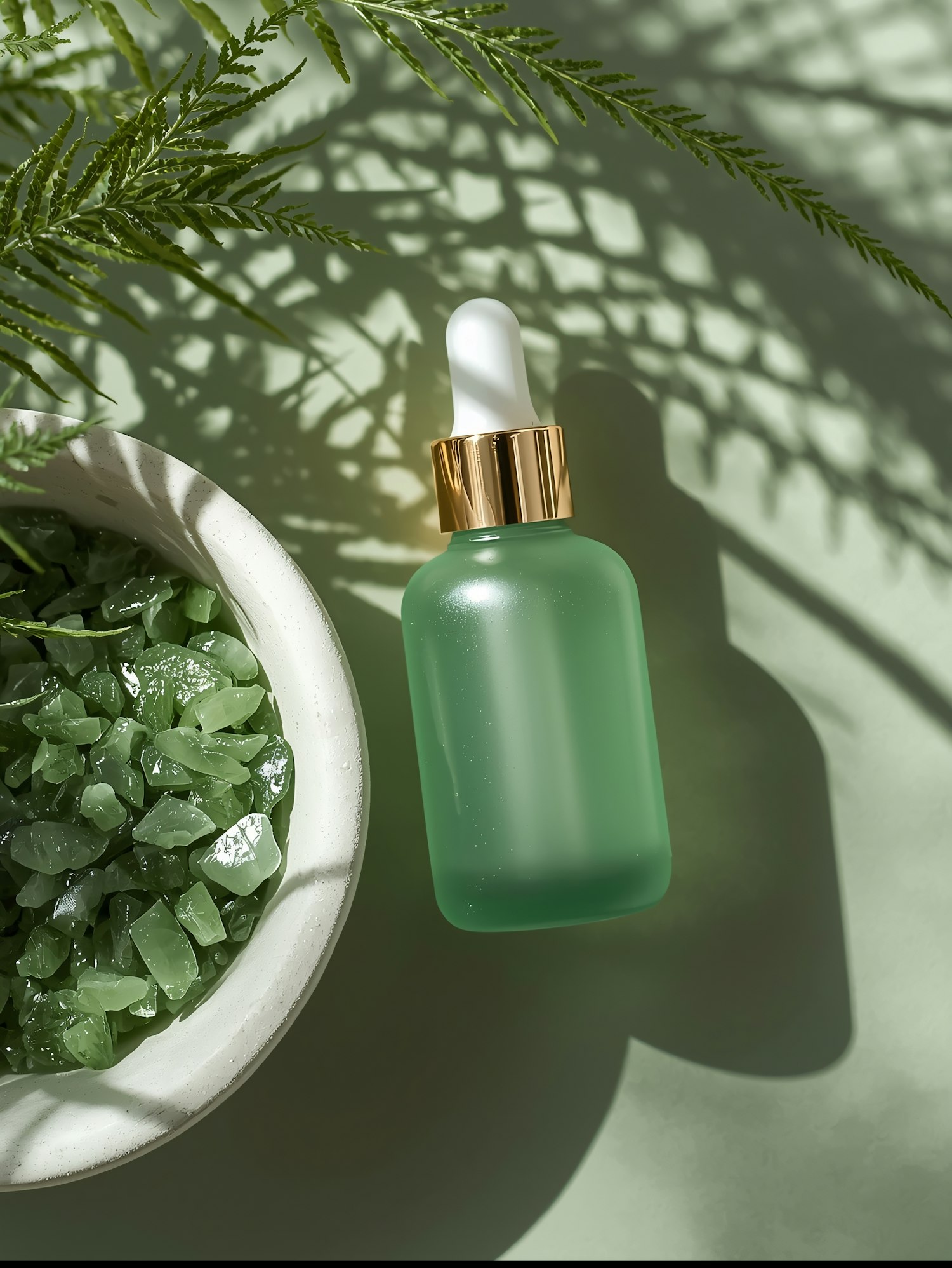 Elegant green dropper bottle with gold accents beside a bowl of green crystals, surrounded by fern shadows on a soft green background.