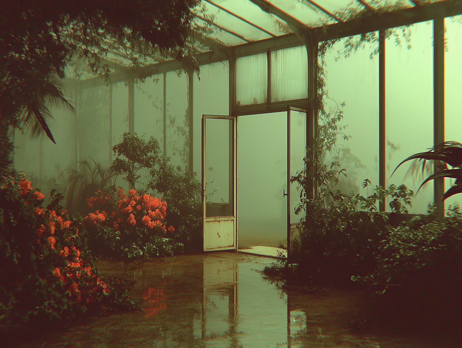 A misty greenhouse with vibrant red flowers, lush greenery, and an open door inviting light into the serene, reflective space.