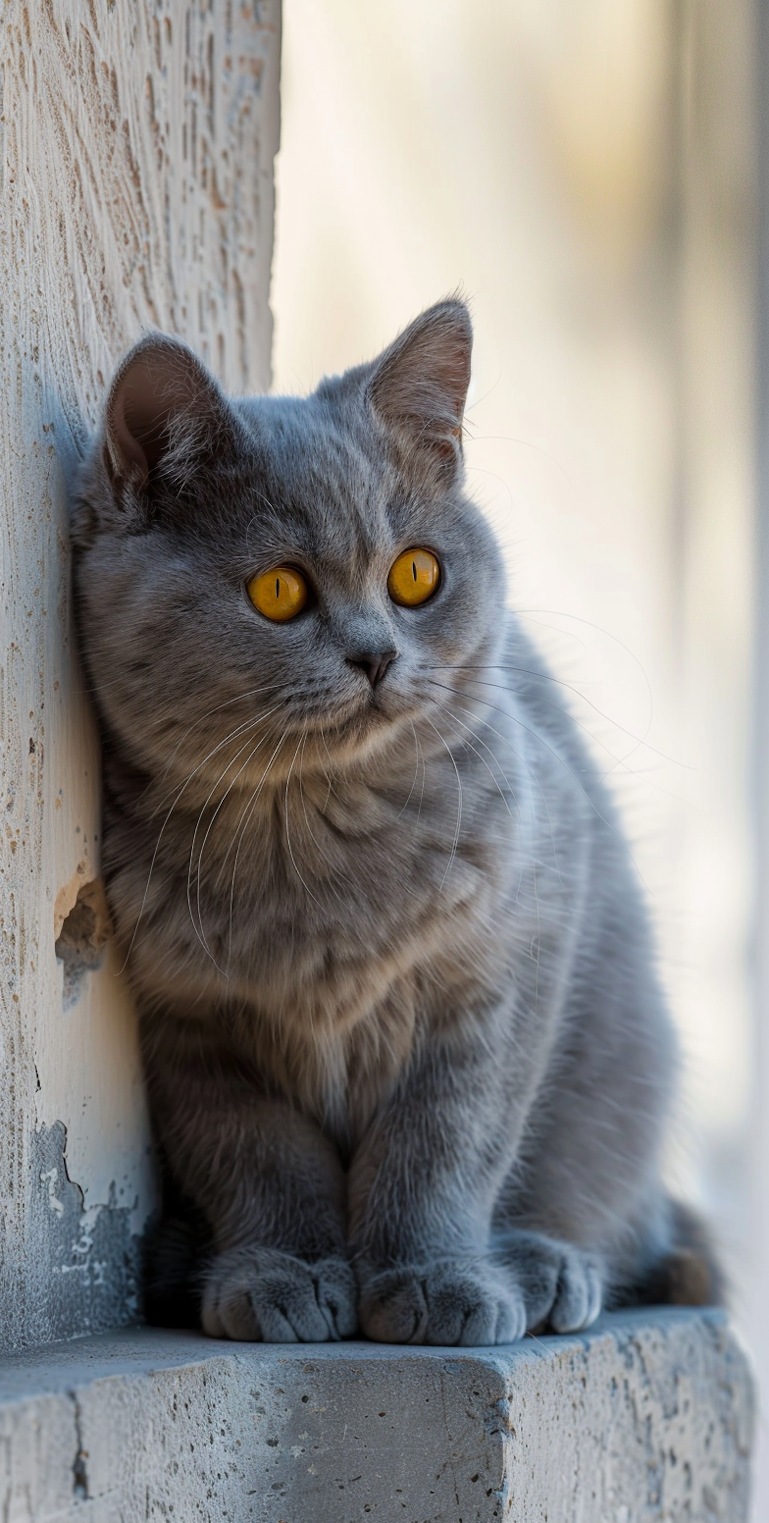 Adorable gray British Shorthair cat with vivid amber eyes sitting on a concrete ledge, exuding curiosity and charm.