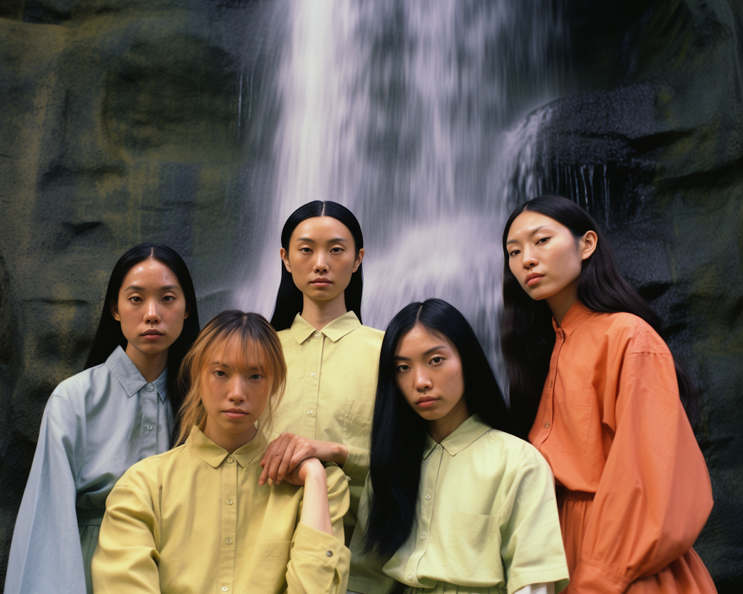 Five women in colorful shirts stand united before a waterfall, exuding calm and strength in a serene natural setting.