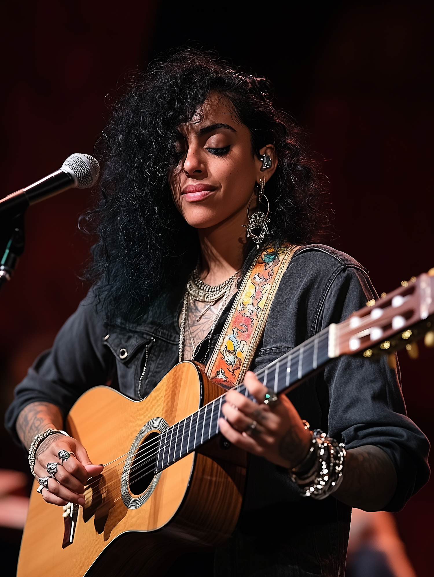 A woman with curly black hair plays an acoustic guitar on stage, wearing a dark jacket and bohemian jewelry, deeply immersed in her music.