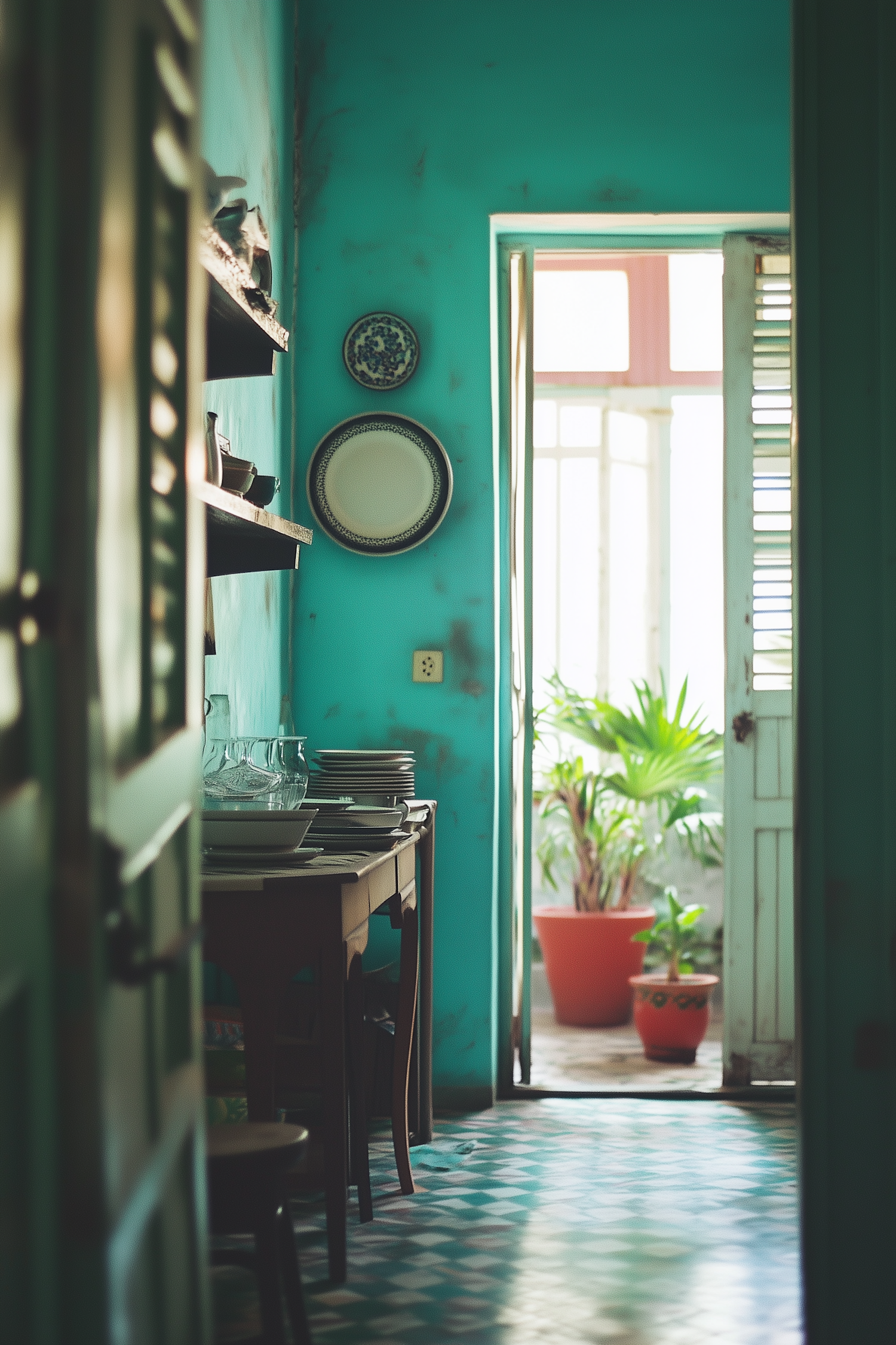 Turquoise hallway with decorative plates, leading to a sunlit room with potted plants. Vintage charm with patterned tiles and elegant decor.