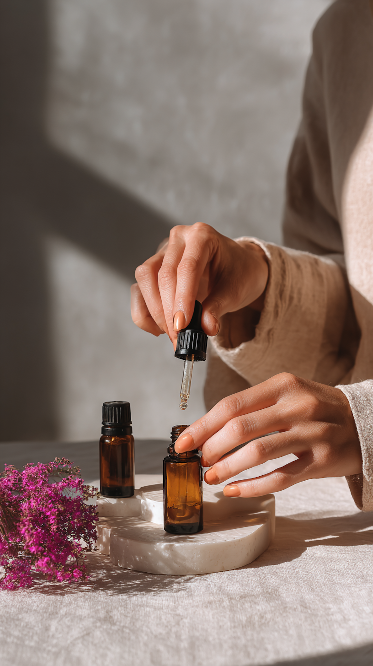 Hands using a dropper to fill amber glass bottles, with pink flowers and soft lighting creating a serene, minimalistic scene.