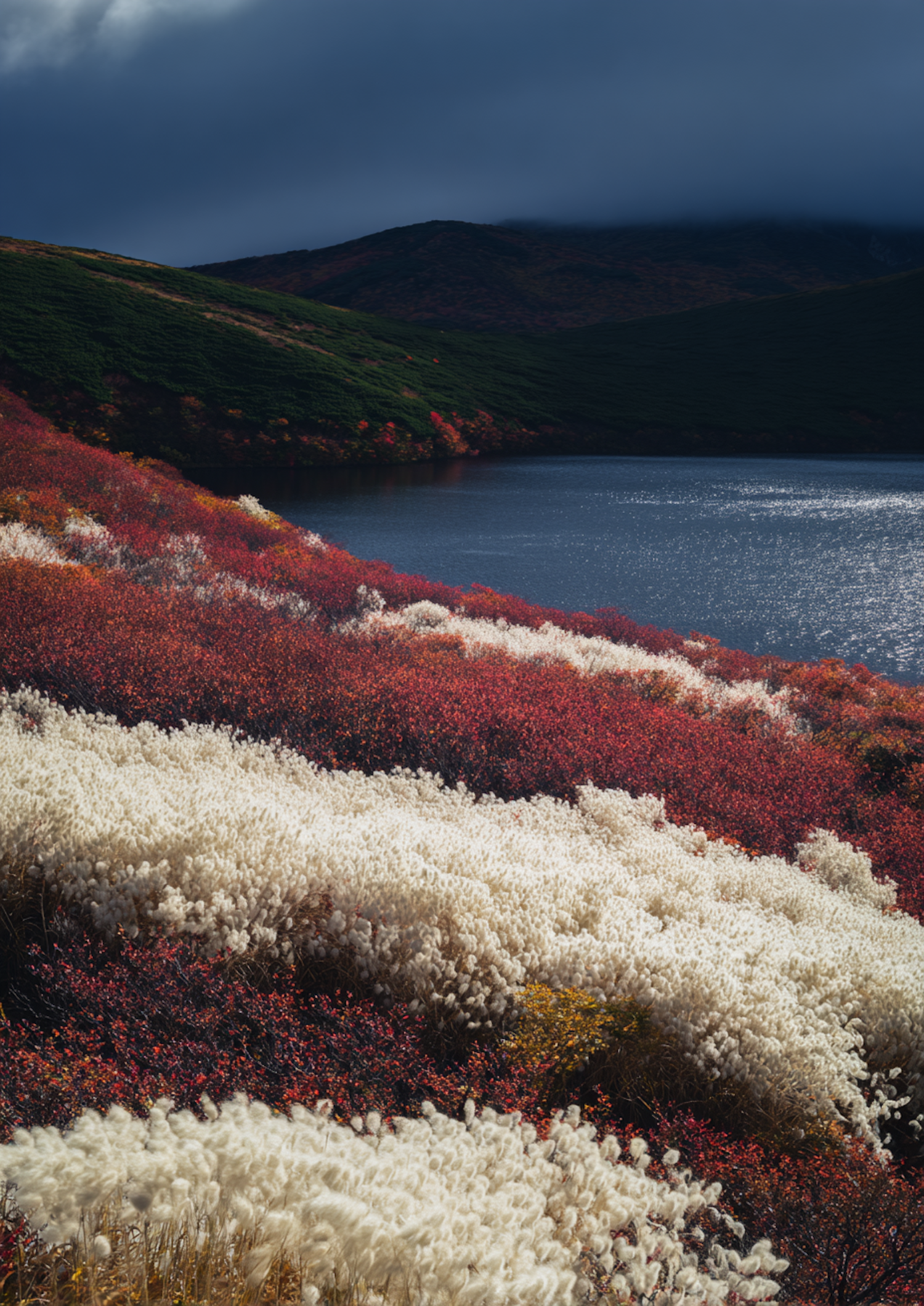 A vibrant hillside with red and white foliage slopes down to a tranquil lake under a dramatic cloudy sky.