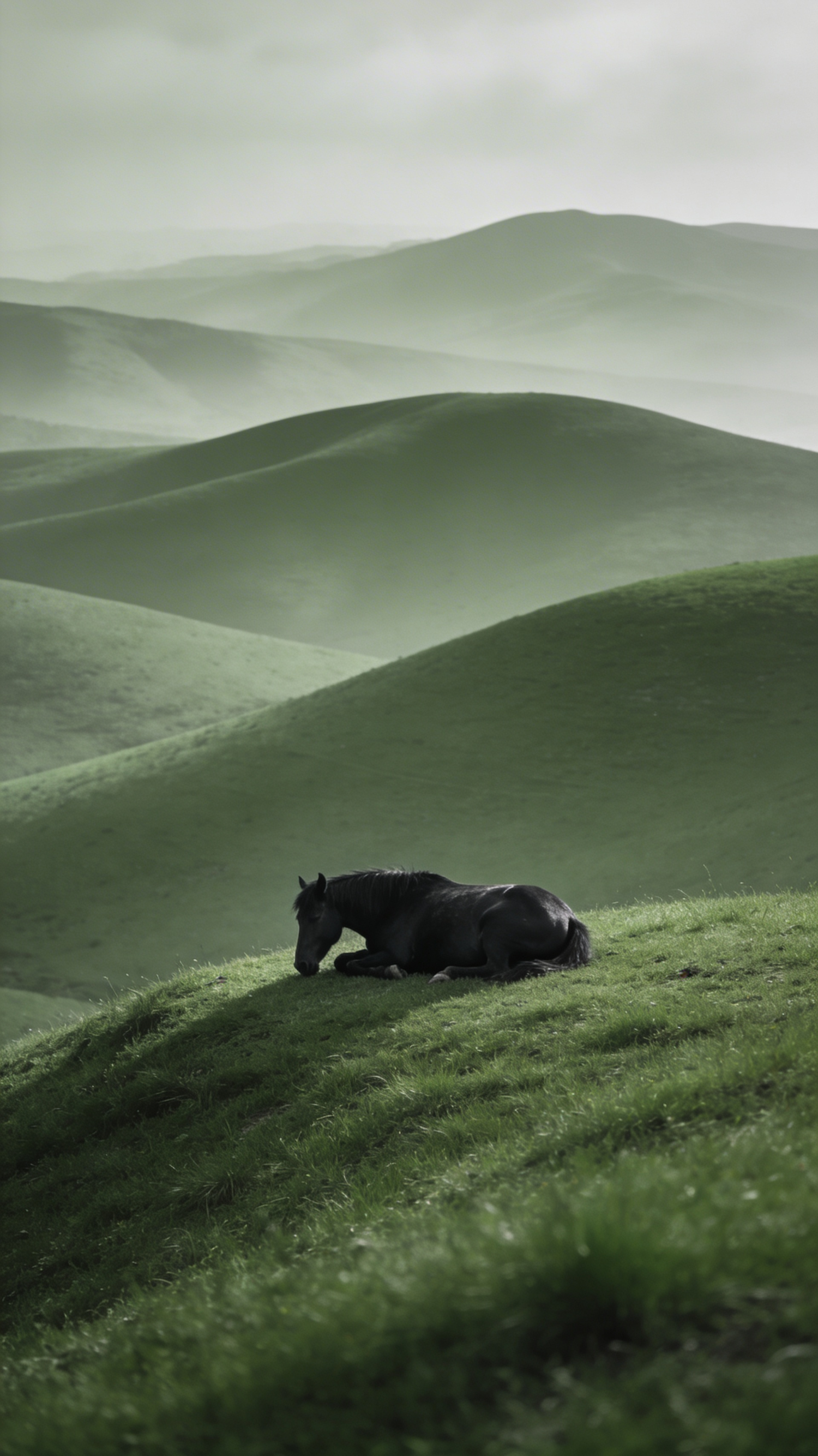 A single black horse lying down peacefully on a grassy hill within smooth rolling green hills, surrounded by vast emptiness. Minimalist surreal landscape, soft overcast light, monochromatic green palette, quiet rest and emotional stillness. Ultra-realistic fine art landscape photography, premium stock image for relaxation and mindfulness concepts. Strong depth and texture, gentle atmospheric haze, natural film-like realism.