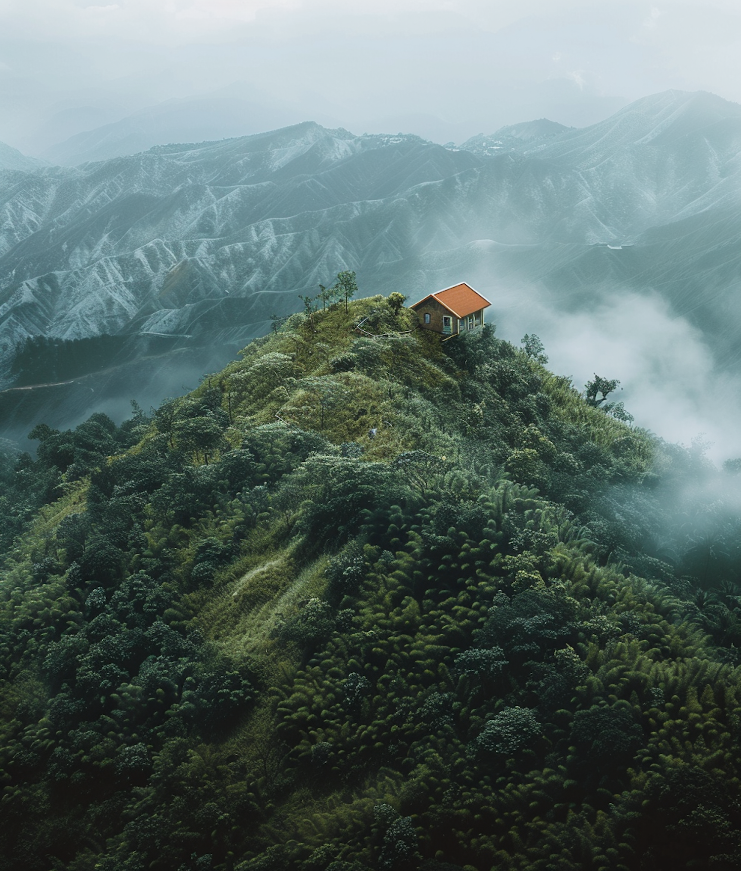 Solitary house with red roof on a lush green hill, surrounded by misty mountains and dense forest, creating a serene atmosphere.