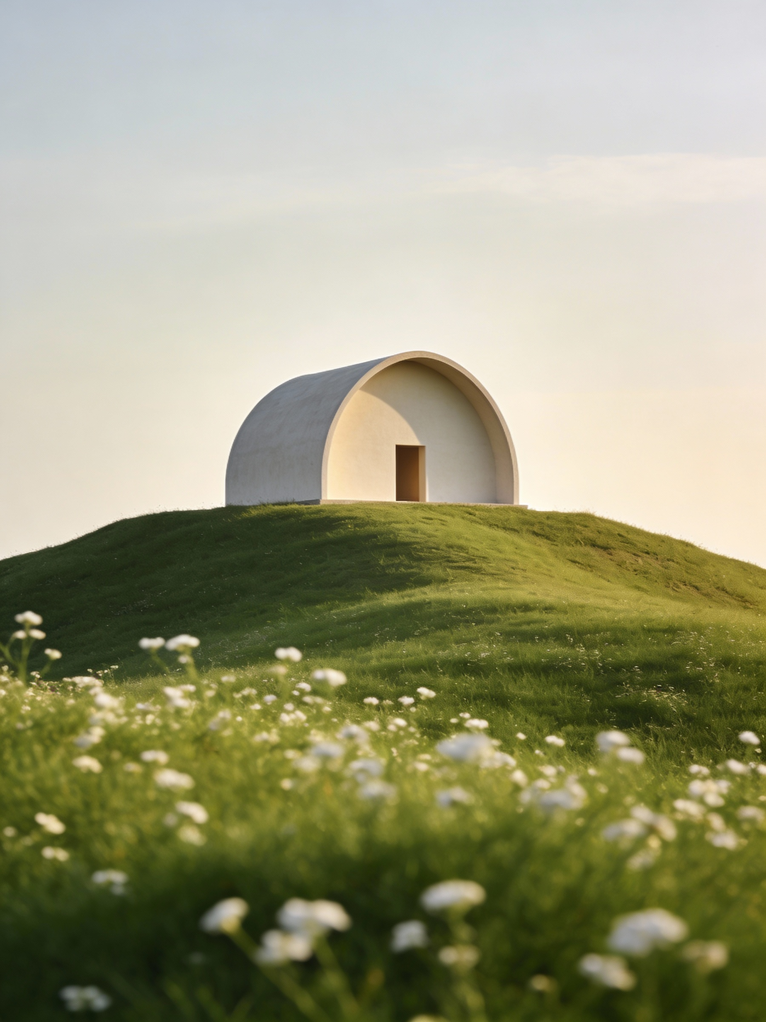 A minimalist white structure on a green hill with white flowers in the foreground, under a serene sky and warm sunlight.