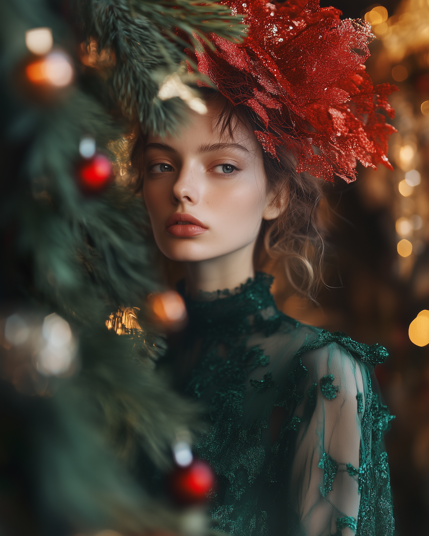 Elegant woman in green lace dress with red headpiece beside a decorated Christmas tree, exuding festive charm and warmth.