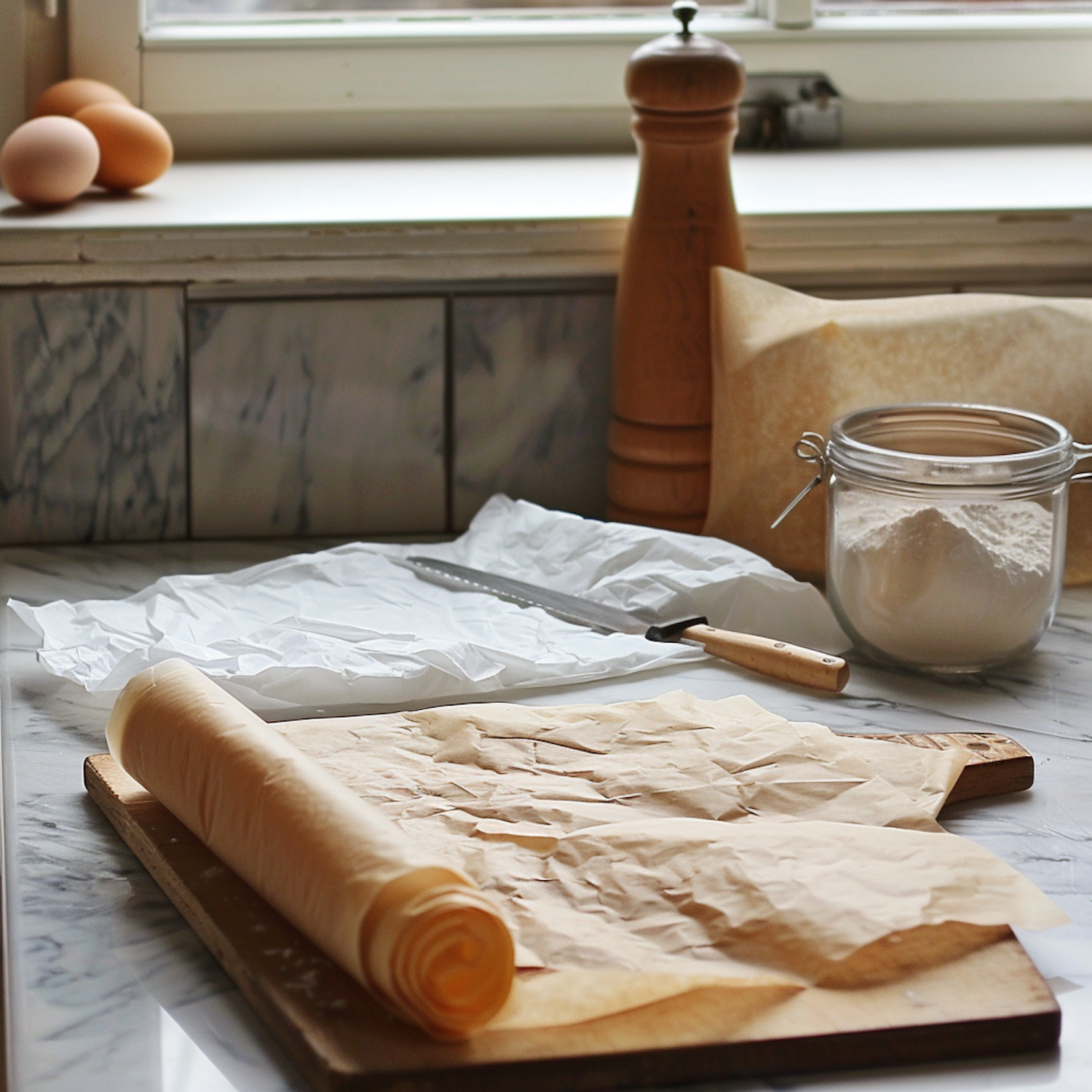 Cozy kitchen scene with baking essentials: parchment paper, flour jar, eggs, and a knife on a marble countertop.