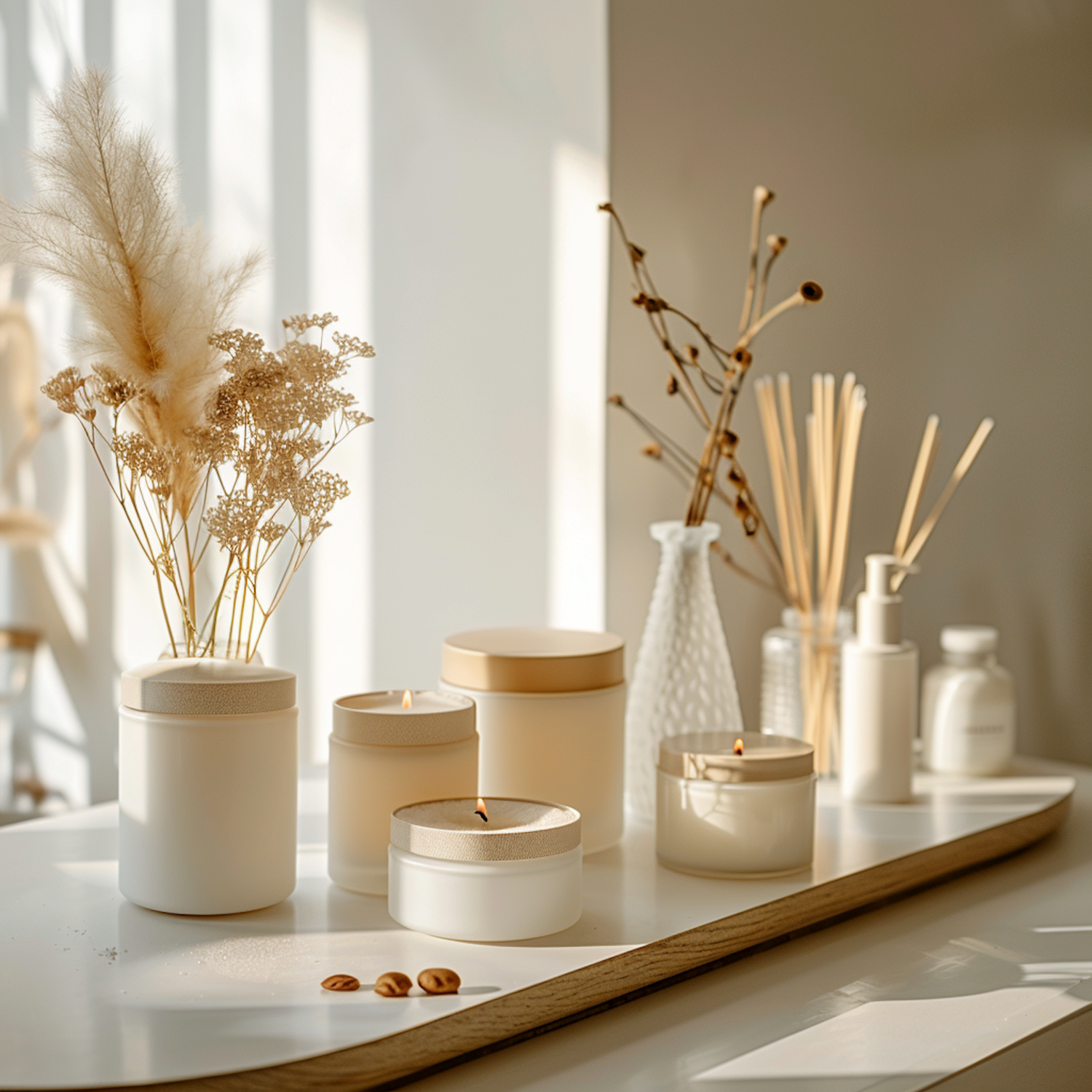 Elegant candles and dried flowers on a white surface, creating a serene and cozy atmosphere with warm tones and natural elements.