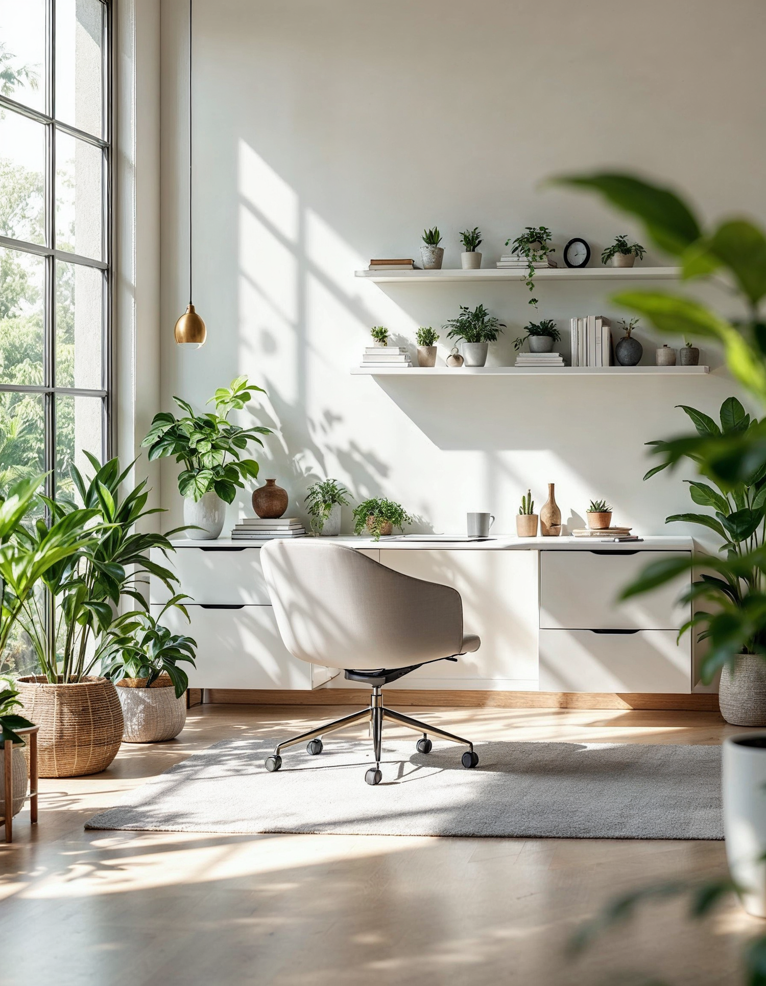Bright home office with plants, white desk, and modern chair. Natural light and greenery create a fresh, inviting atmosphere.
