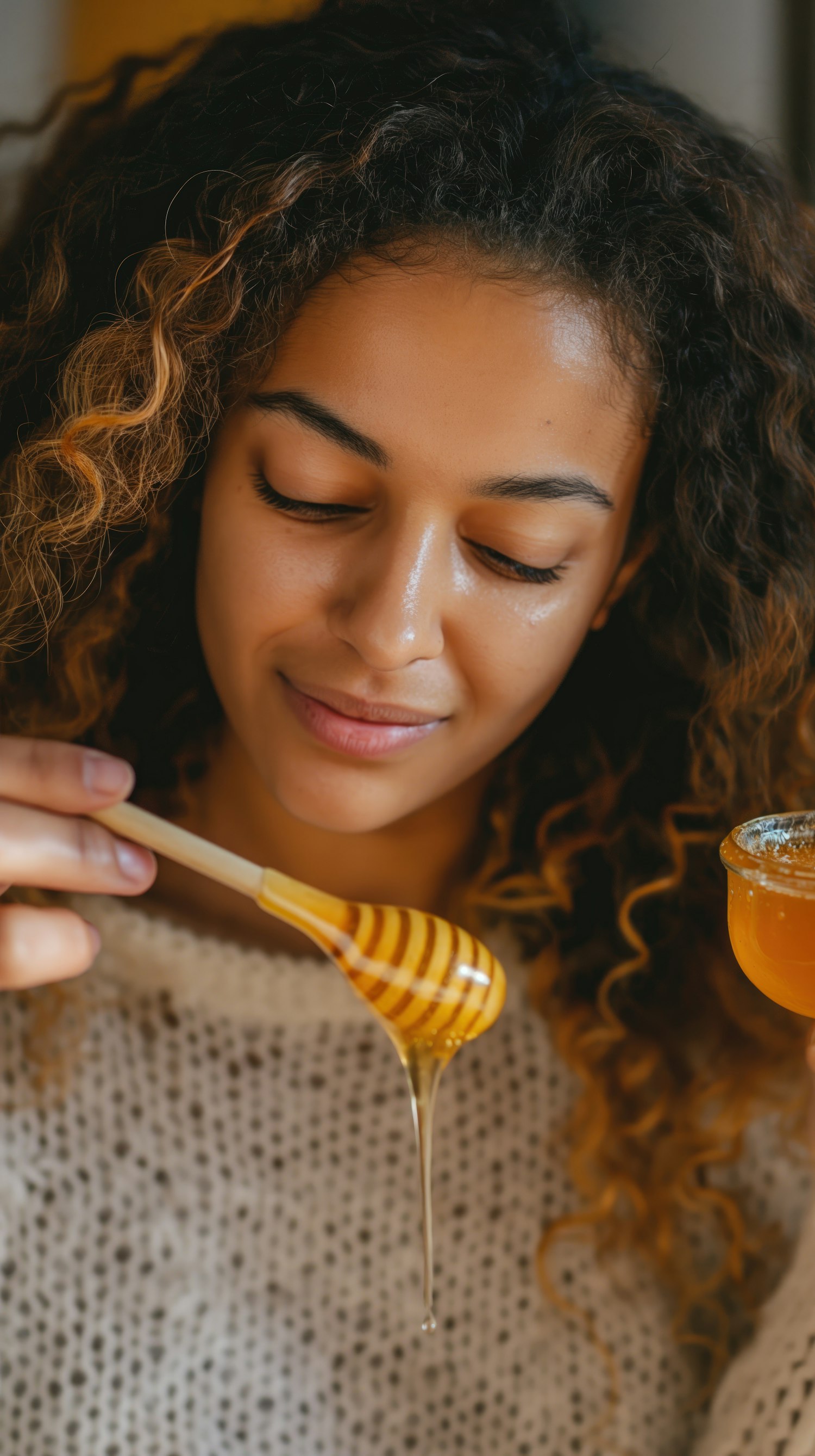 Young woman with curly hair enjoys honey, holding a dipper and glass jar. Warm lighting highlights her serene expression.