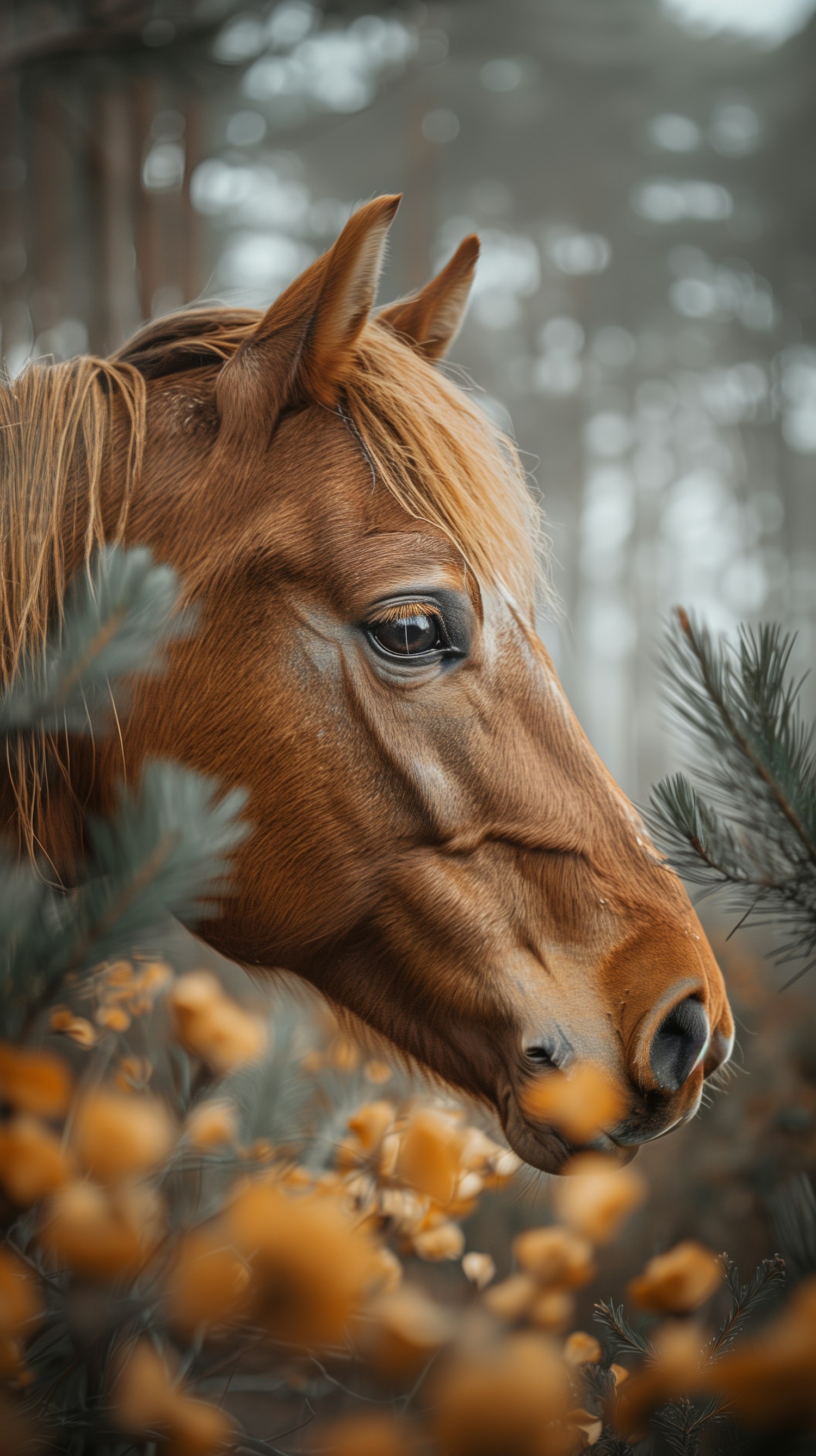 Close-up of a brown horse in a misty forest, surrounded by orange flowers and branches, creating a serene and natural scene.