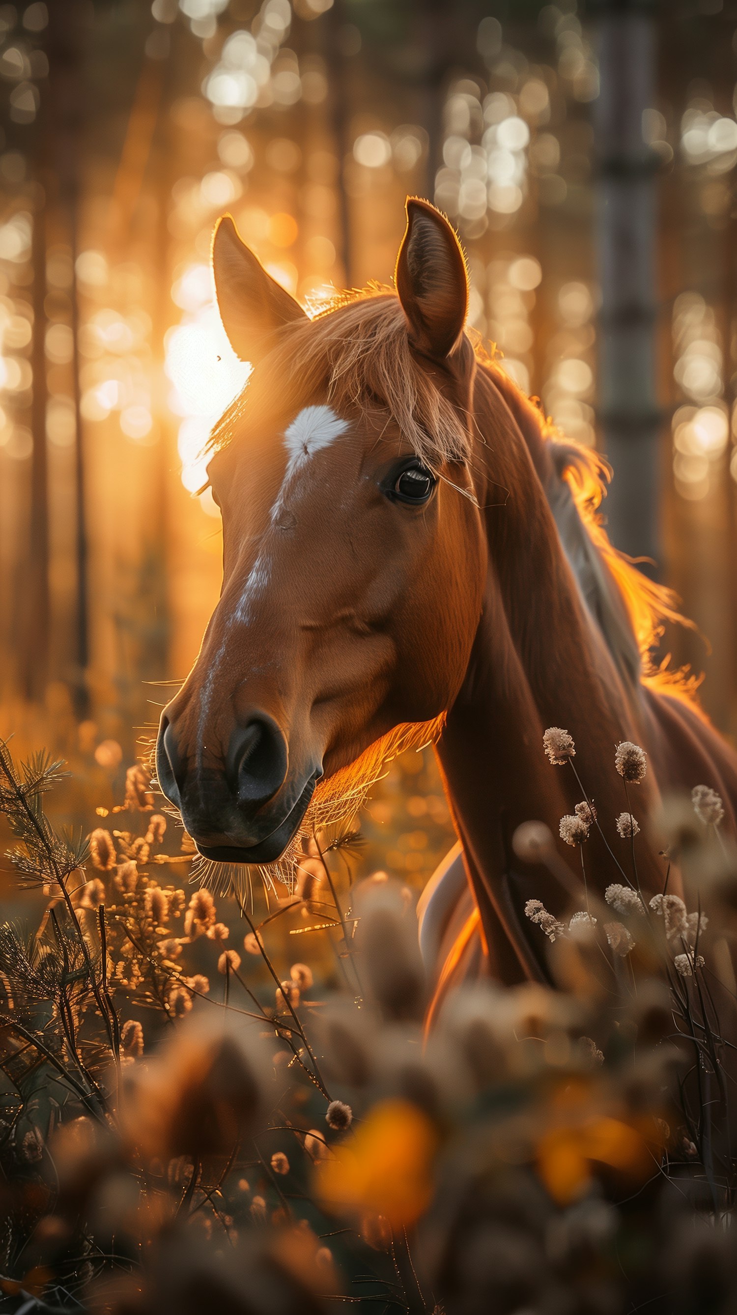 Majestic chestnut horse in a sunlit forest, surrounded by wildflowers and golden light, creating a serene and picturesque scene.