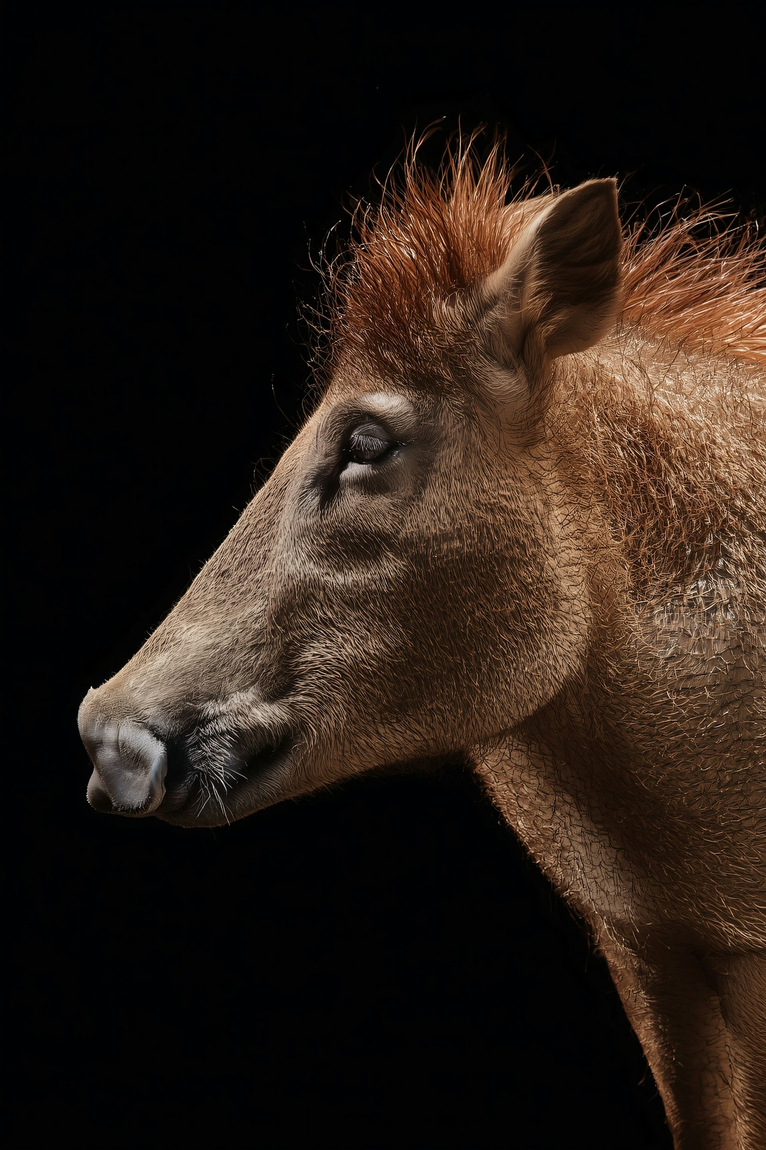 A close-up profile of a horse with a light brown coat and reddish mane, set against a black background, highlighting its serene expression.