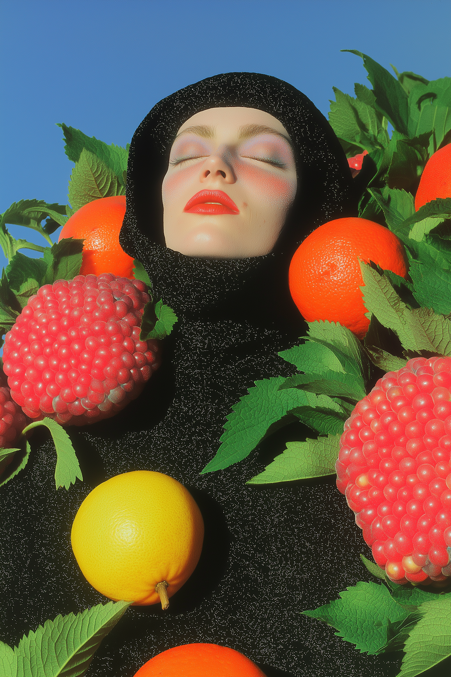 Surreal portrait of a woman in a black hood surrounded by vibrant fruits and leaves against a clear blue sky.