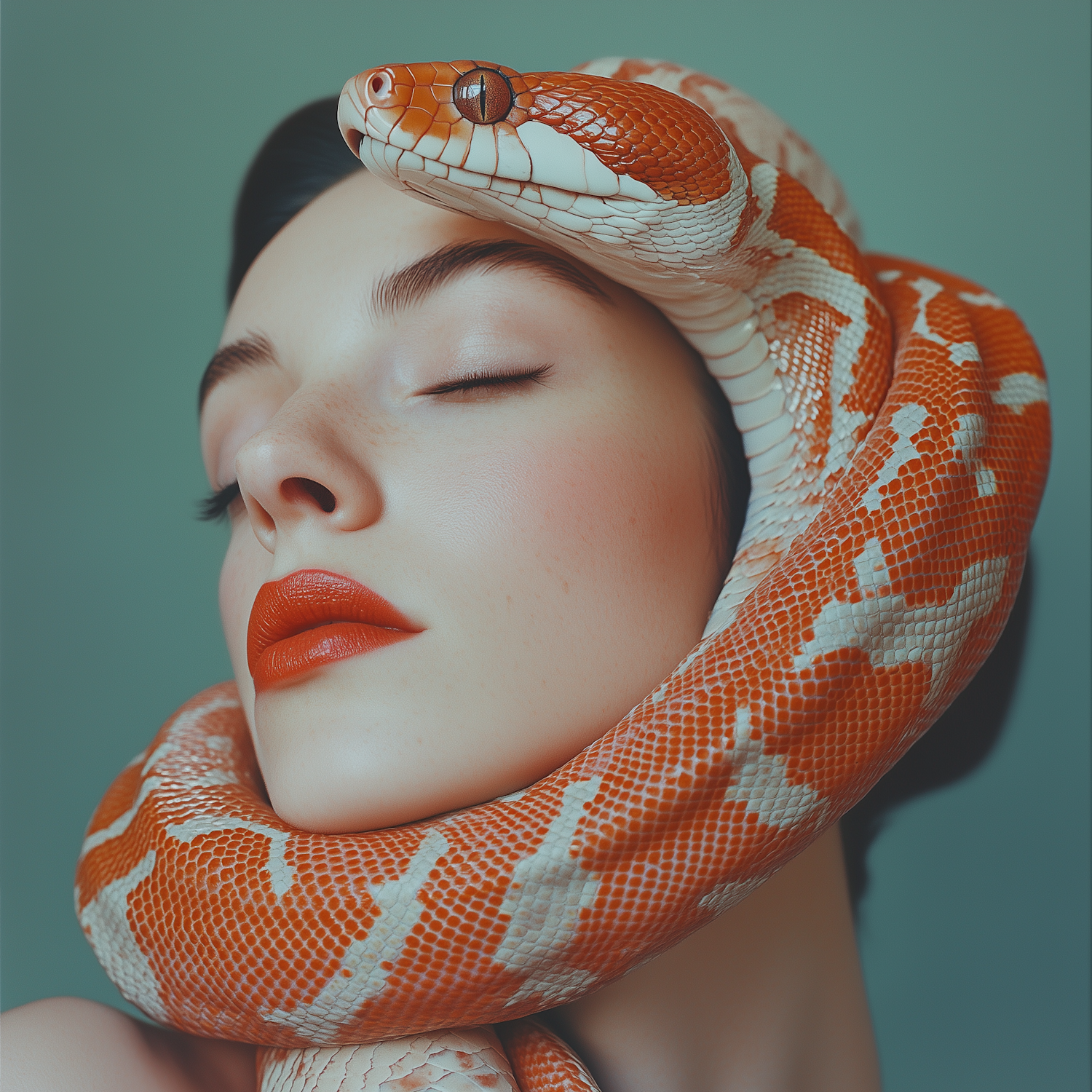A serene woman with bold red lips and a vibrant orange snake coiled around her, set against a muted teal background.