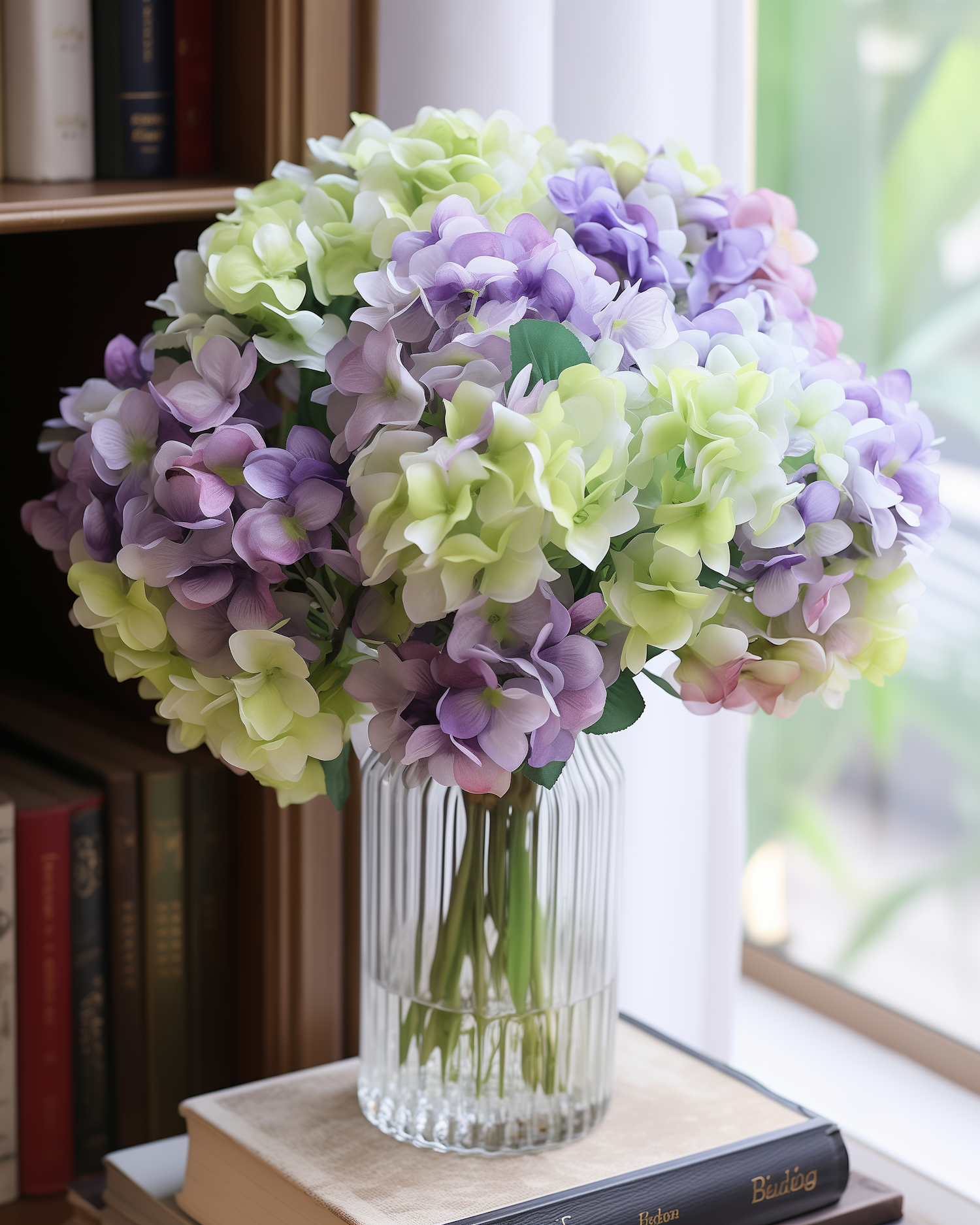 Elegant hydrangea bouquet in a ribbed glass vase, showcasing soft pastel colors, placed on books by a window with natural light.