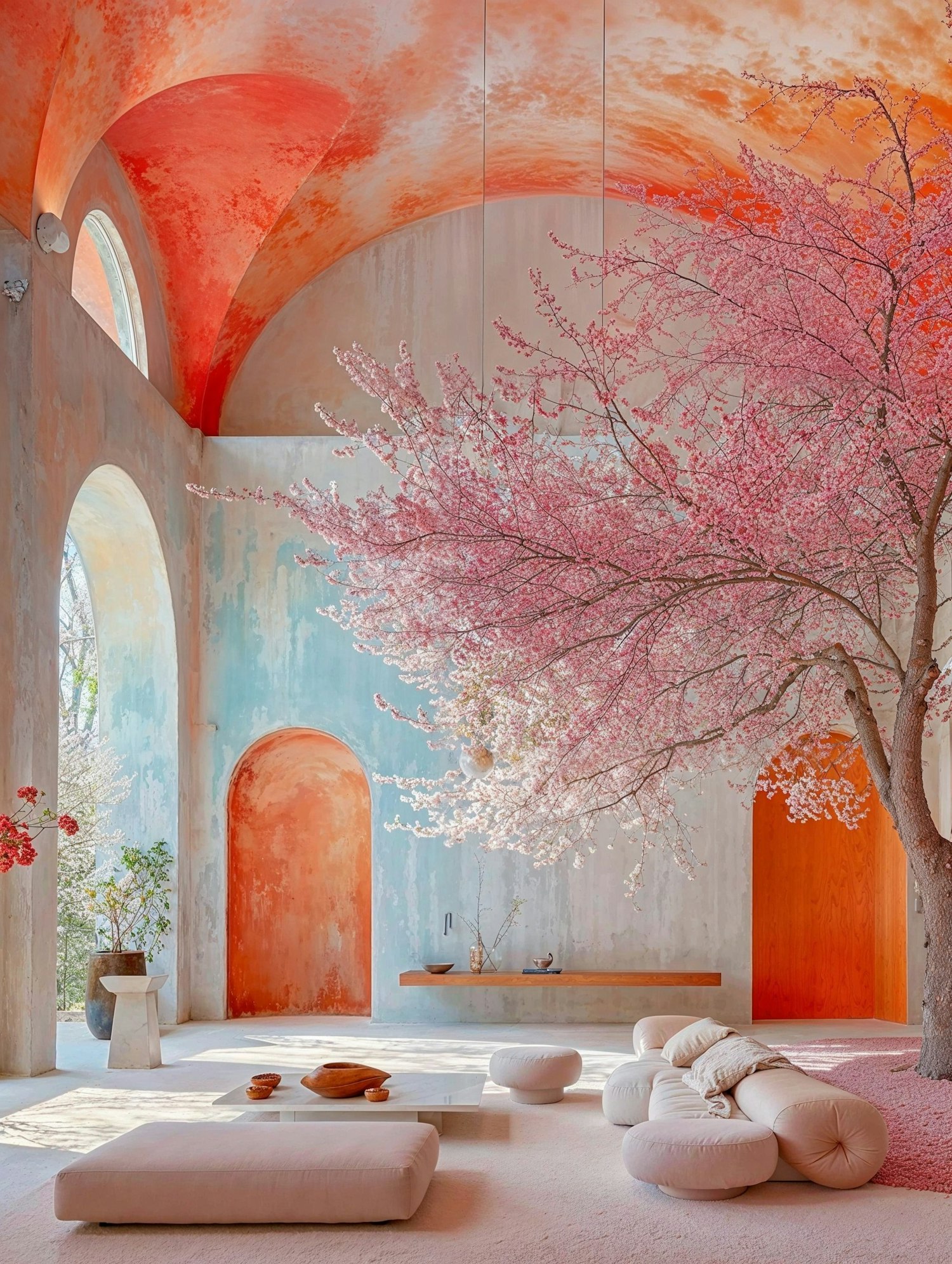 Artistic interior with cherry blossom tree, arched ceilings, and minimalist furniture. Warm orange and blue tones create a serene ambiance.