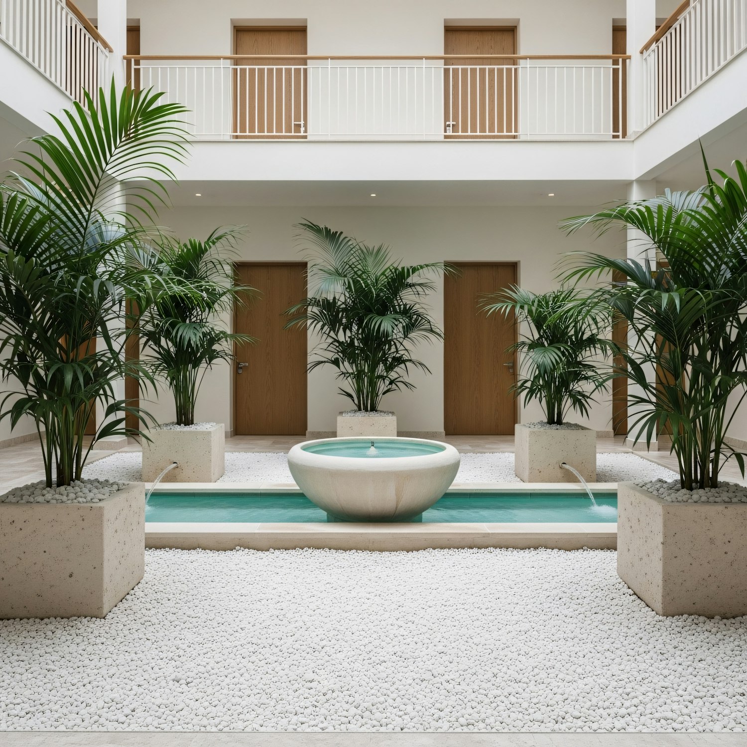 Modern indoor courtyard with a central fountain, lush green plants, white pebbles, and minimalist architecture for a serene ambiance.