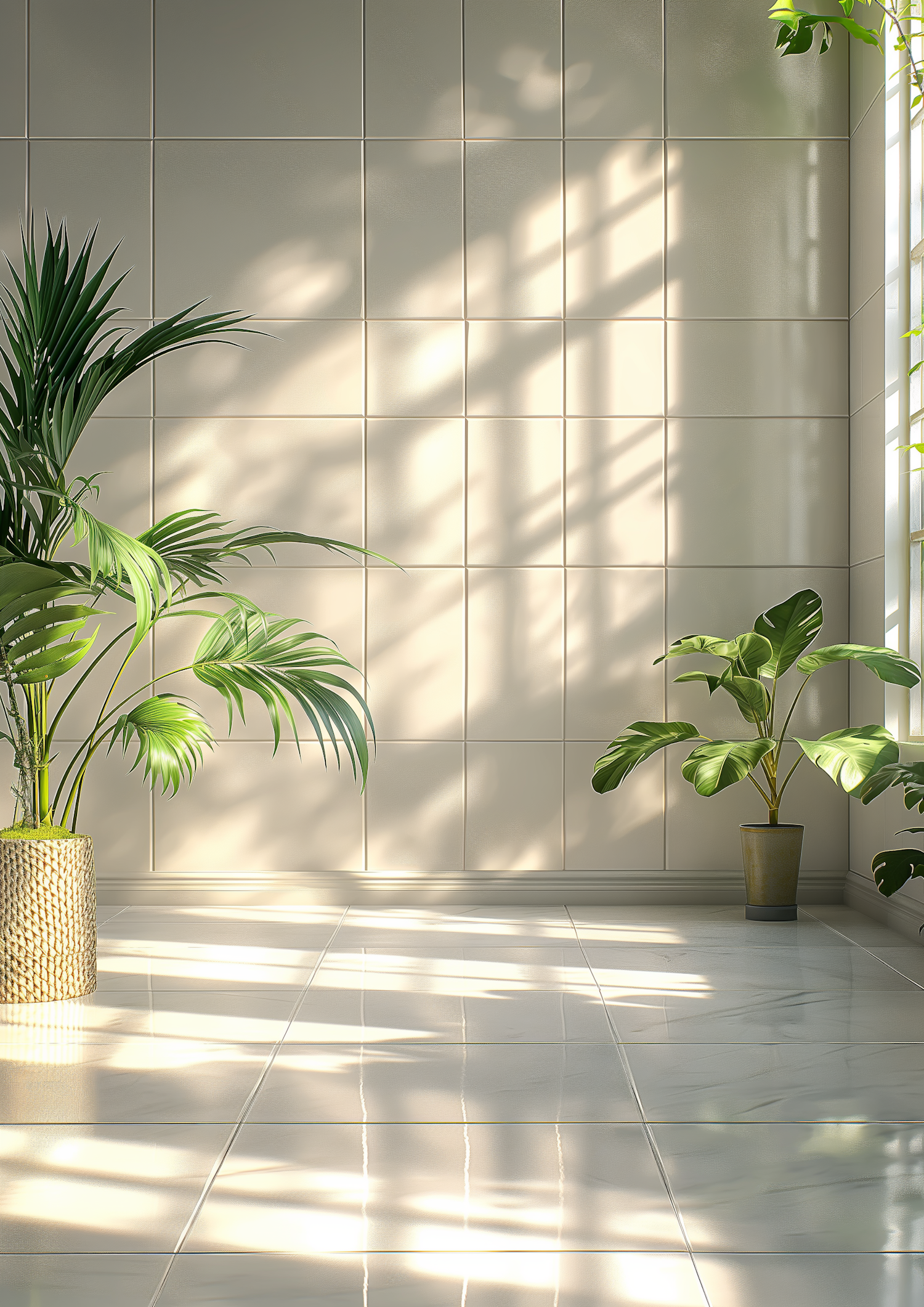 Sunlit room with cream tiles and vibrant green potted plants, creating a serene and natural atmosphere with soft shadows.