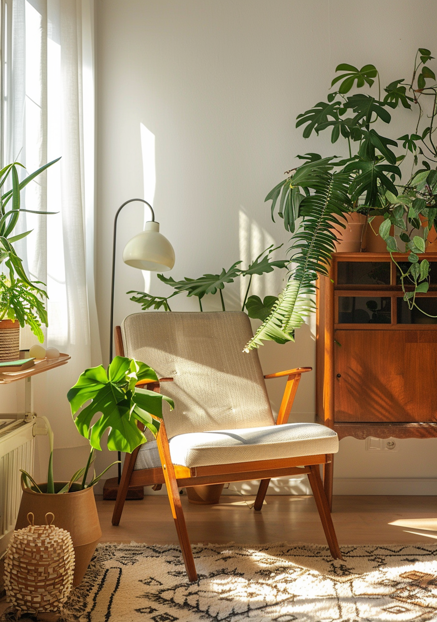 Cozy room corner with a mid-century chair, lush plants, and warm sunlight. Perfect for relaxation and reading.